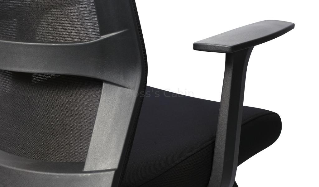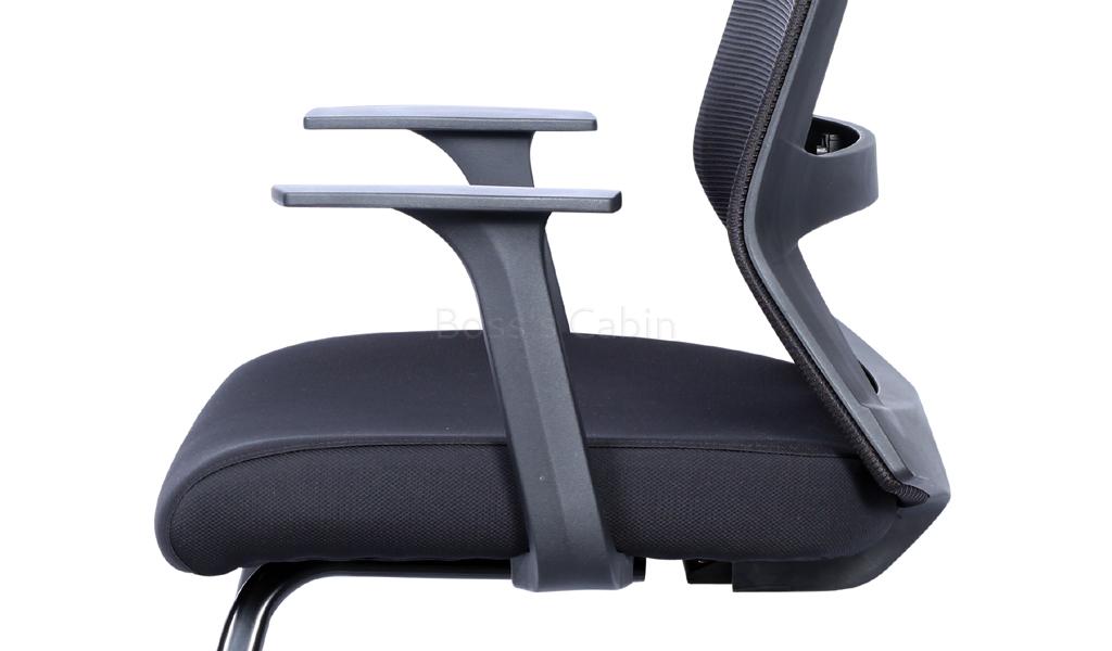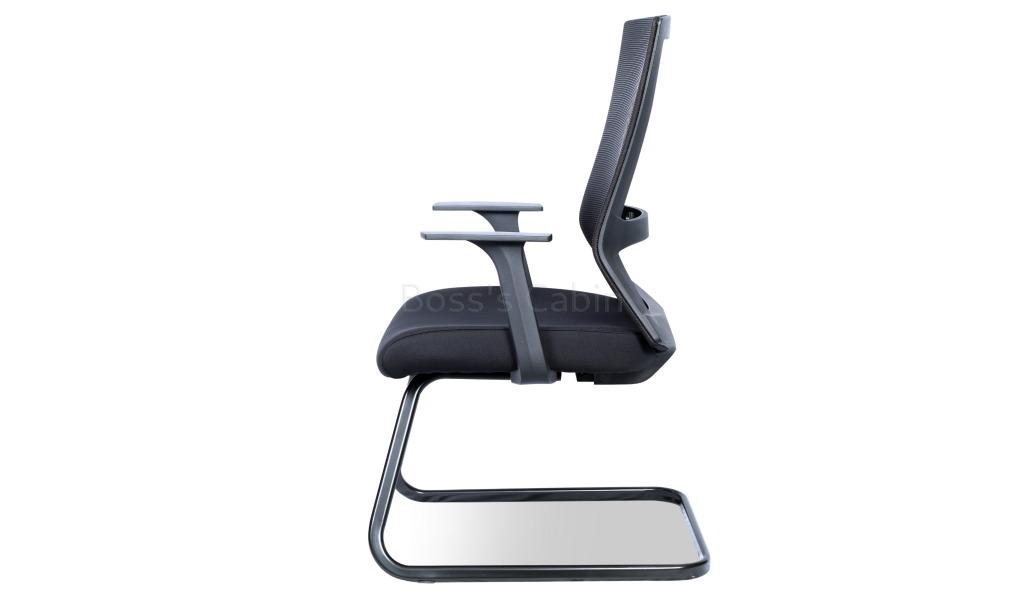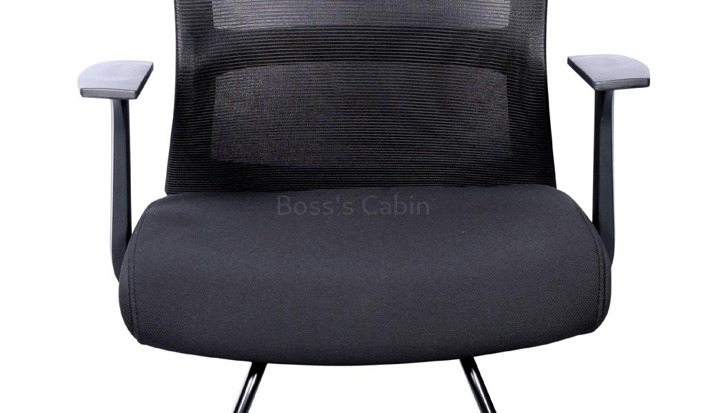 An ergonomically designed visitors chair with contemporary looks. Mesh back with black PU frame, cushioned fabric seat and black steel sled base with PU armrests.
