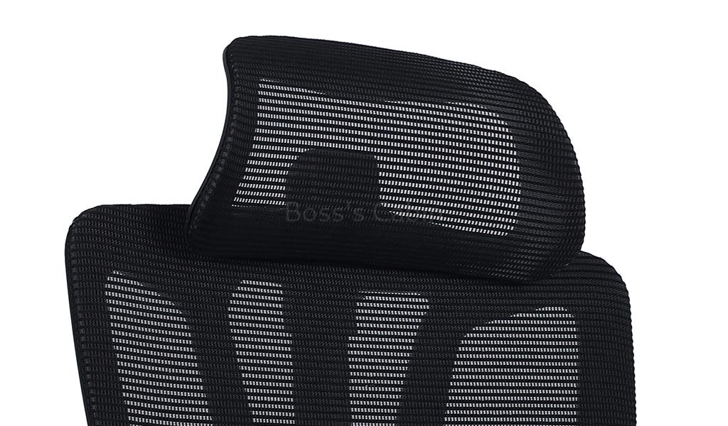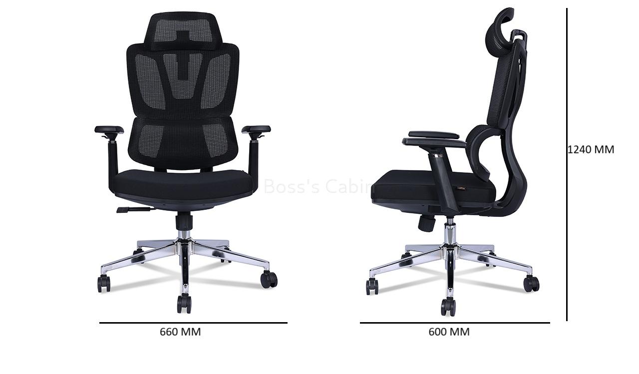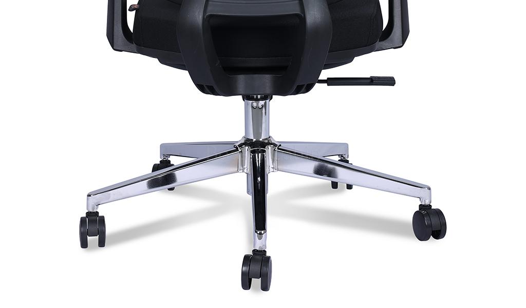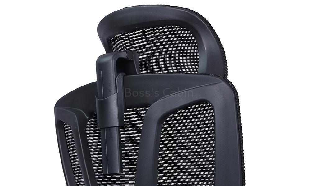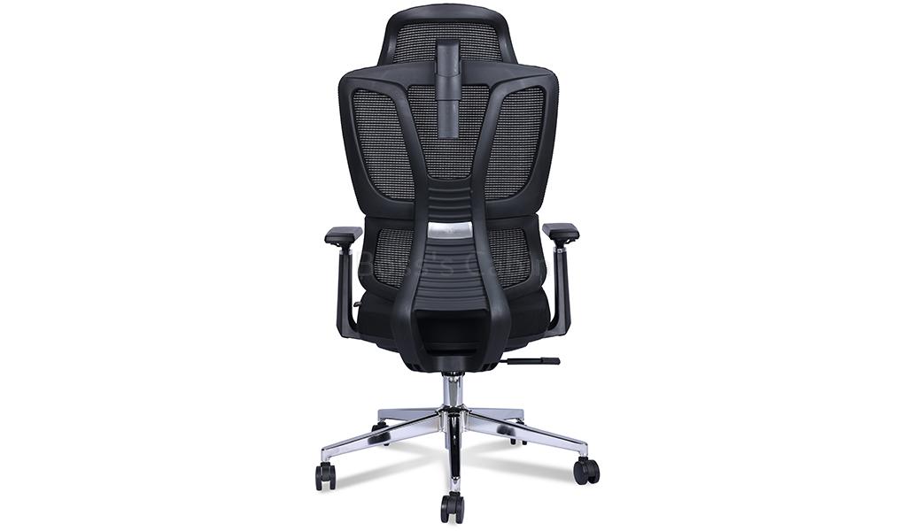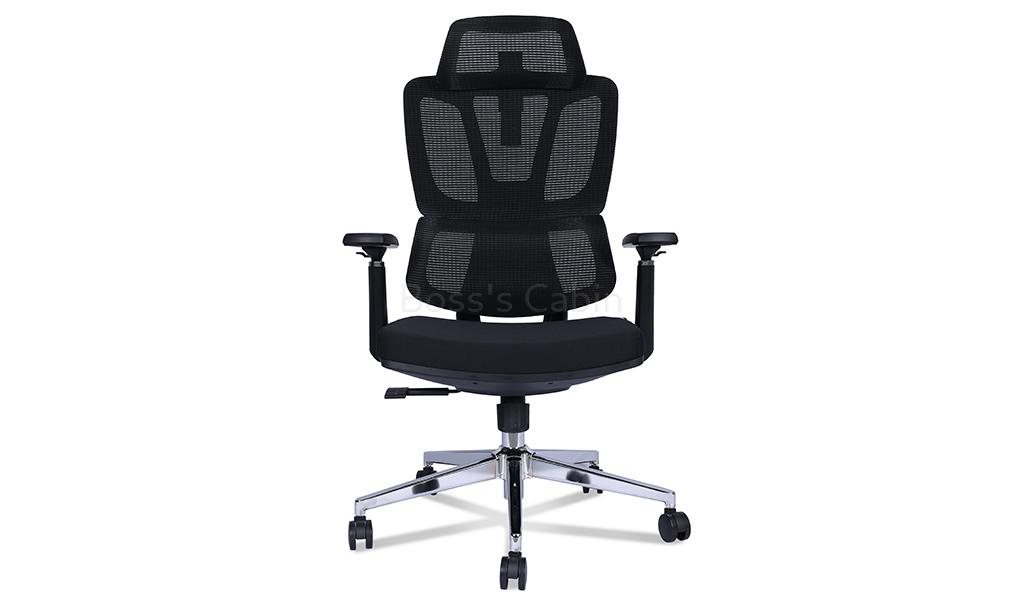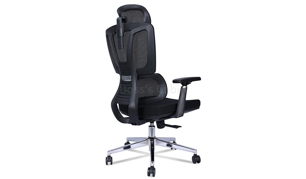 A high back office chair designed to provide maximum support and comfort. High strength mesh back in PP frame, two way adjustable headrest, threeway adjustable armrests, mesh-fabric seat with seat shell, synchronized tilt mechanism with multi-position lock, polished aluminum alloy five star base with PA castors. Ideal for long hours of comfortable sitting.