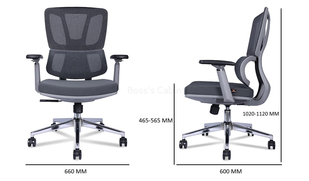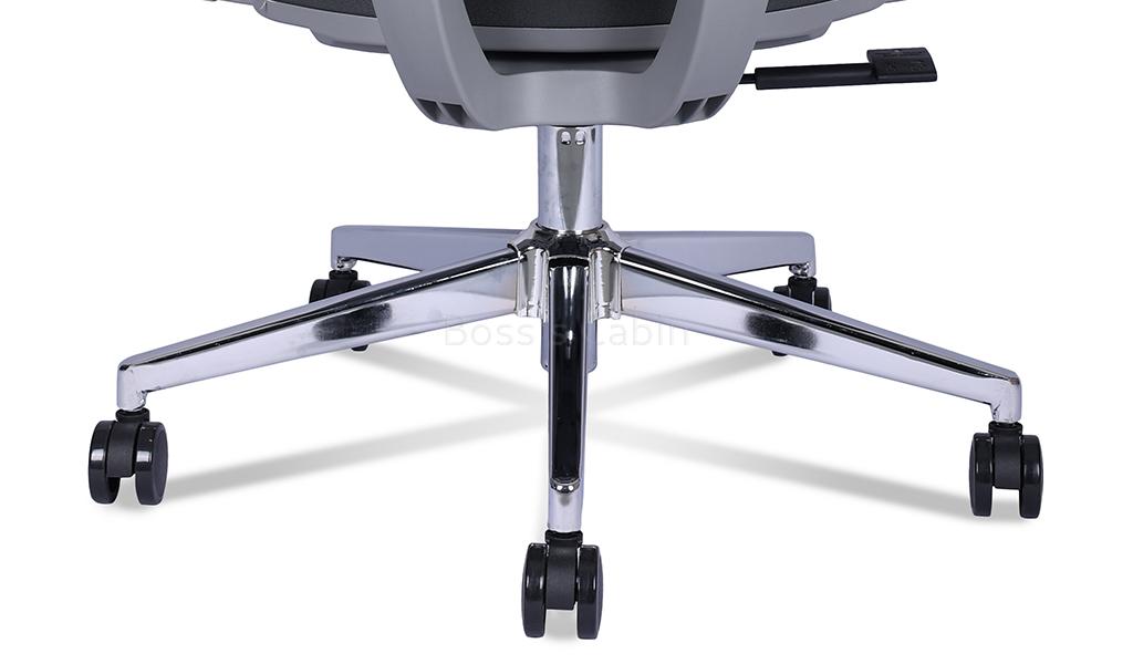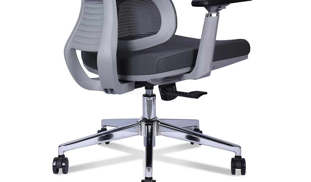 A medium back office chair in light gray frame designed to provide maximum support and comfort. High strength mesh back in PP frame, threeway adjustable armrests, mesh-fabric seat with seat shell, synchronized tilt mechanism with multi-position lock, polished aluminum alloy five star base with PA castors. Ideal for long hours of comfortable sitting.