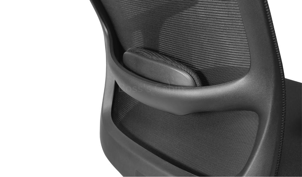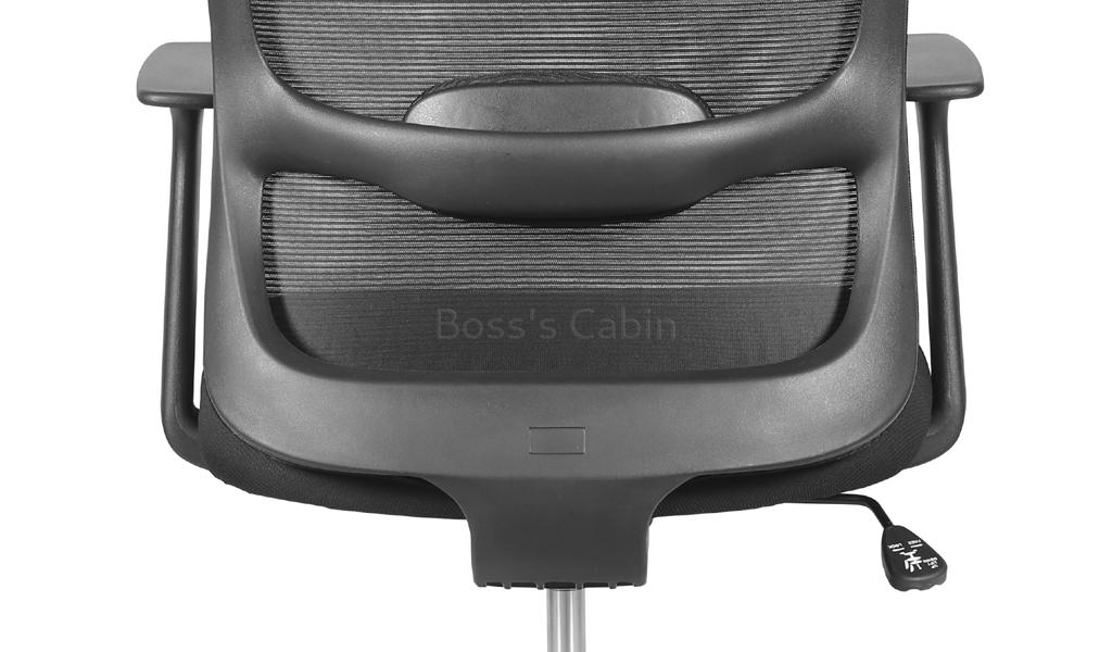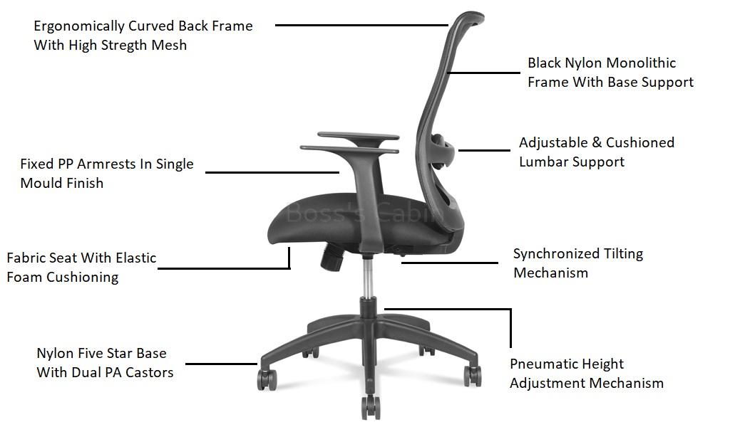 A medium back office chair with advanced features. Designed for maximum comfort and back support, it includes adjustable lumbar support, synchronized tilt mechanism, high strength mesh back, breathable mesh fabric seat with elastic foam cushion, fixed PP armrests and black nylon five star base.
