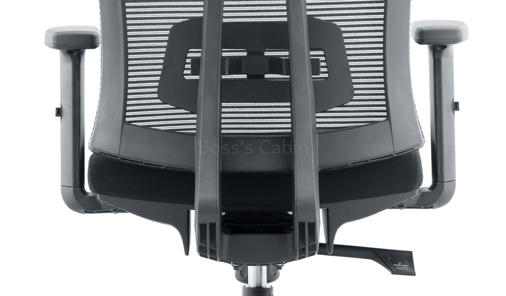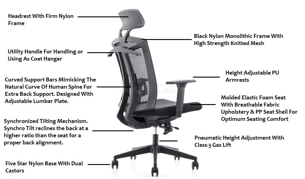 A well designed ergonomic chair with adjustable lumbar support designed for maximum comfort and back support. The ergonomic backrest comes with with a firm lower back support that can be adjusted to suit your comfort. Built with synchro-tilt mechanism, height adjustable armrests, high strength mesh back, cushioned fabric seat with seat shell, and nylon five star base with PA castors. A strong and sturdy chair perfect for executives & managers.