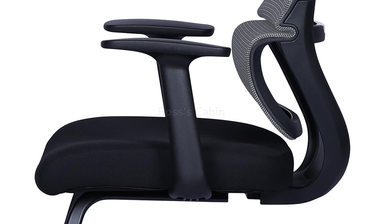 A mid back visitors chair in black PP frame and gray color mesh backrest. Two part back rest with curved lower part for maximum lumbar support, high strength mesh back in black PP frame, fixed armrests, fabric seat, fixed sled type base in black powder coated steel. Ideal for office visitors.