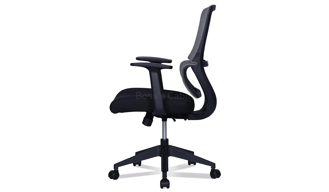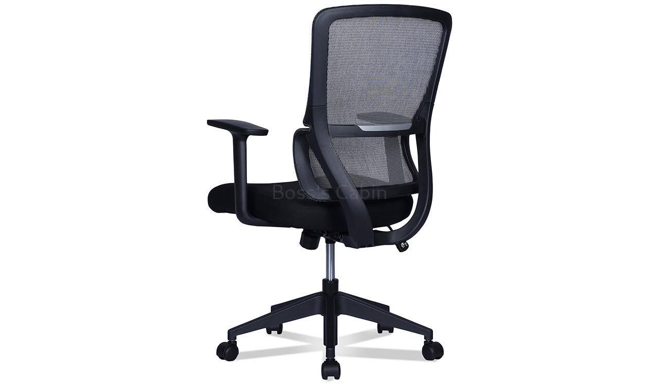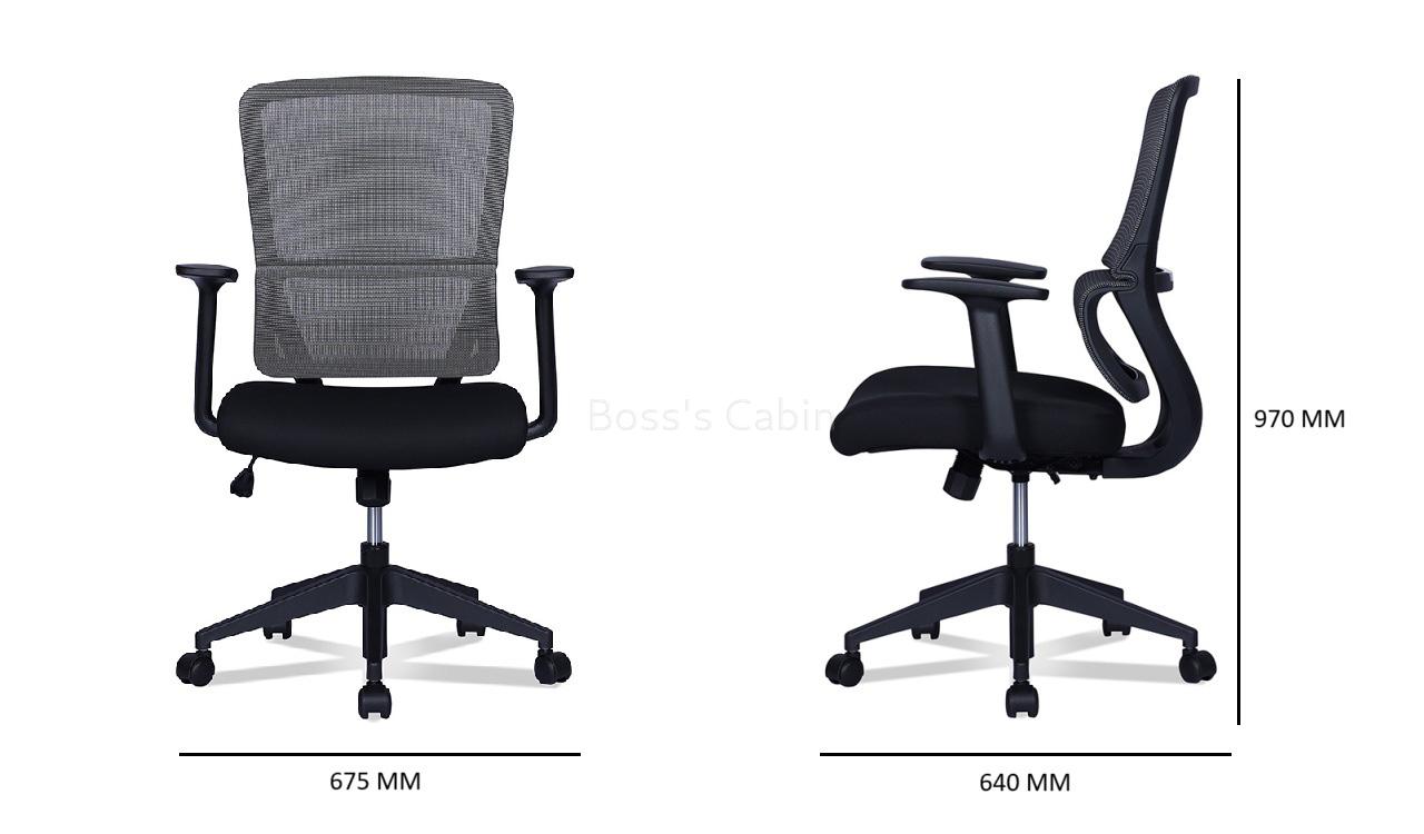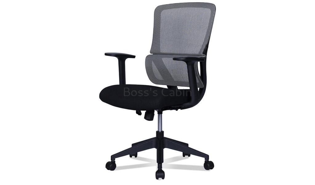 A mid back office chair in black frame and gray mesh backrest. Two part back rest with curved lower part for maximum lumbar support, high strength mesh back in black PP frame, fixed armrests, fabric seat, standard tilt mechanism, class III gas lift, PP yamo five star base with PA castors. Ideal for long hours of comfortable sitting.
