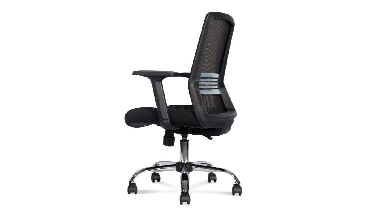 A sleek medium back executive chair with adjustable lumbar support designed for maximum comfort and back support. Includes a simple yet effective ergonomic backrest with a firm lower back support that can be adjusted to suit your comfort. Built with tilt mechanism with tension control, high strength mesh back, cushioned fabric seat, adjustable PU armrests and a chromed steel five star base. A strong and sturdy chair perfect for staff and visitor seating.