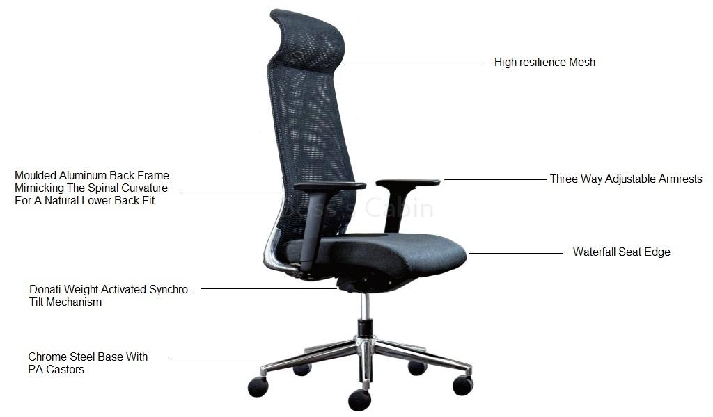 A premium general use chair with advanced ergonomic features recommended for intensive use 6 to 8 hours per day. Easy to operate high back multi-function office chair Mesh back, foam mesh seat and high density PU foam seat cushion. Lumbar support feature. supports your lower back and natural curve of your spine. Synchronized mechanism and weight sensitive tilt tension control. Synchro tilt helps keep proper balance between your torso and legs so that neither has too much pressure when you sit for extended periods. Multi-position locking. Padded armrests with three way adjustment for maximum comfort. Pneumatic one touch seat height adjustment Heavy duty polished steel base with nylon castors for easy mobility and lasting durability.
