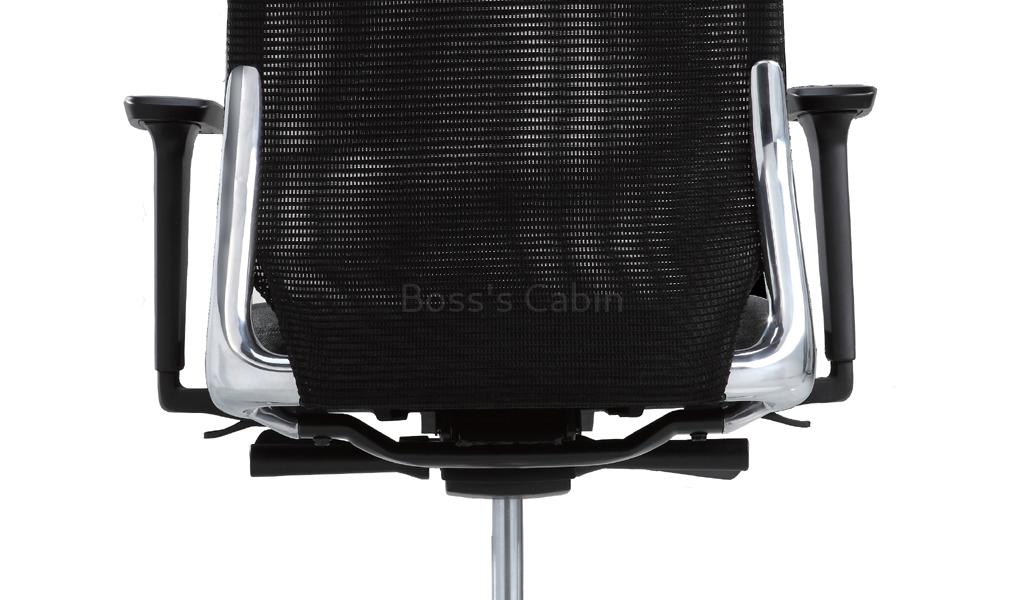 High back chair with weight sensitive mechanism from Donati, Italy that automatically controls tilt tension according to your weight. Features synchronized tilt, multi-position locking, mesh back, fabric seat, 3 way adjustable arms and five star polished steel base with PA castors.