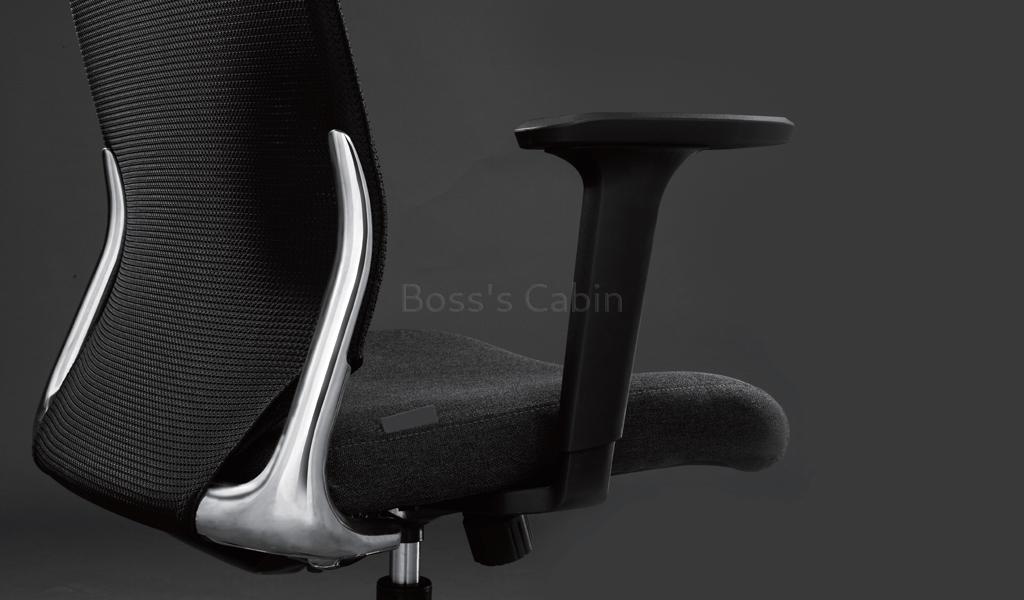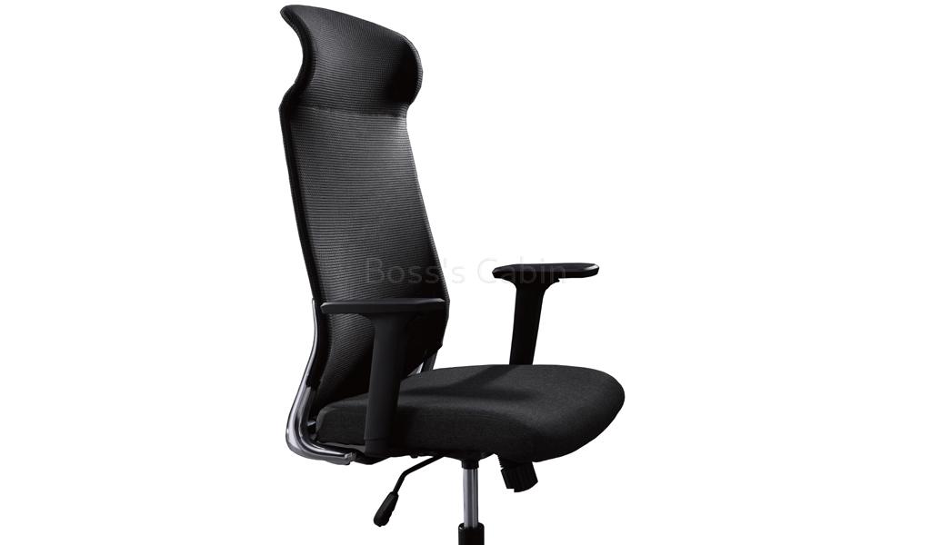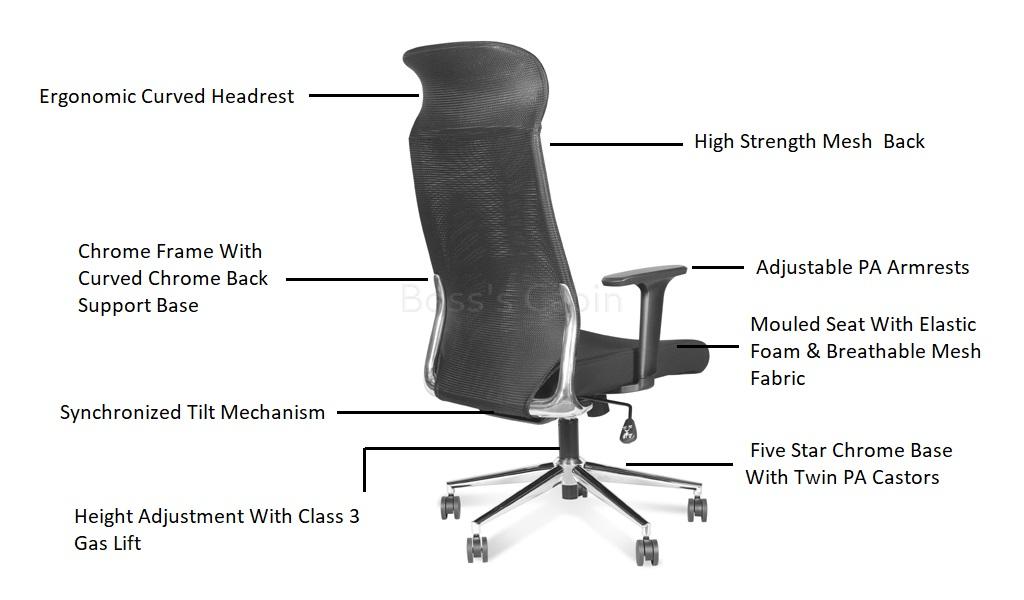 High back chair with premium synchro-tilt mechanism. Synchro tilt helps keep proper balance between your torso and legs so that neither has too much pressure when you sit for extended periods. Includes premium features like curved chrome frame with headrest, high strength mesh back, cushioned seat with moulded elastic foam, breathable mesh fabric upholstery, two way adjustable PA armrests and five star chromed steel base with twin PA castors.