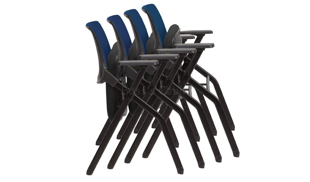 A sleek training chair with castors and writing pad that can be stacked horizontally for easy storage. Blue mesh backrest, fabric seat with PP seat shell, chrome finished steel frame and nylon castors. Functional, cost efficient, sturdy and durable. A perfect choice for training centers and classrooms.