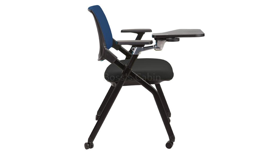 A foldable training / classroom chair with writing pad and wheels suitable for institutions, coaching centers, auditoriums etc. A medium back multi-purpose chair with a writing pad. Breathable blue mesh back with high density molded foam & fabric seat and nylon frame. Nylon loop fixed armrests for maximum comfort. Light chrome finished steel base with nylon castors and foldable seat Ergonomic design that supports your lower back and natural curve of your spine.