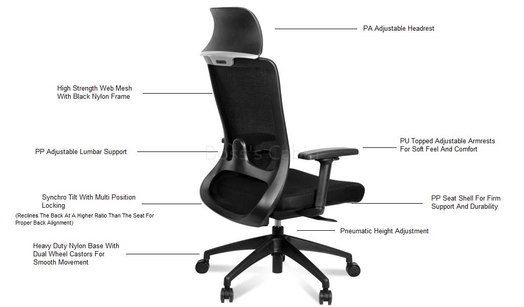 Designed for maximum comfort and support this office chair offers adjustable lumbar support. Also included are other ergonomic features like synchronized tilt mechanism, multi-position locking, high strength mesh back, breathable fabric seat, adjustable PU armrests, black PA adjustable headrest and black nylon five star base.