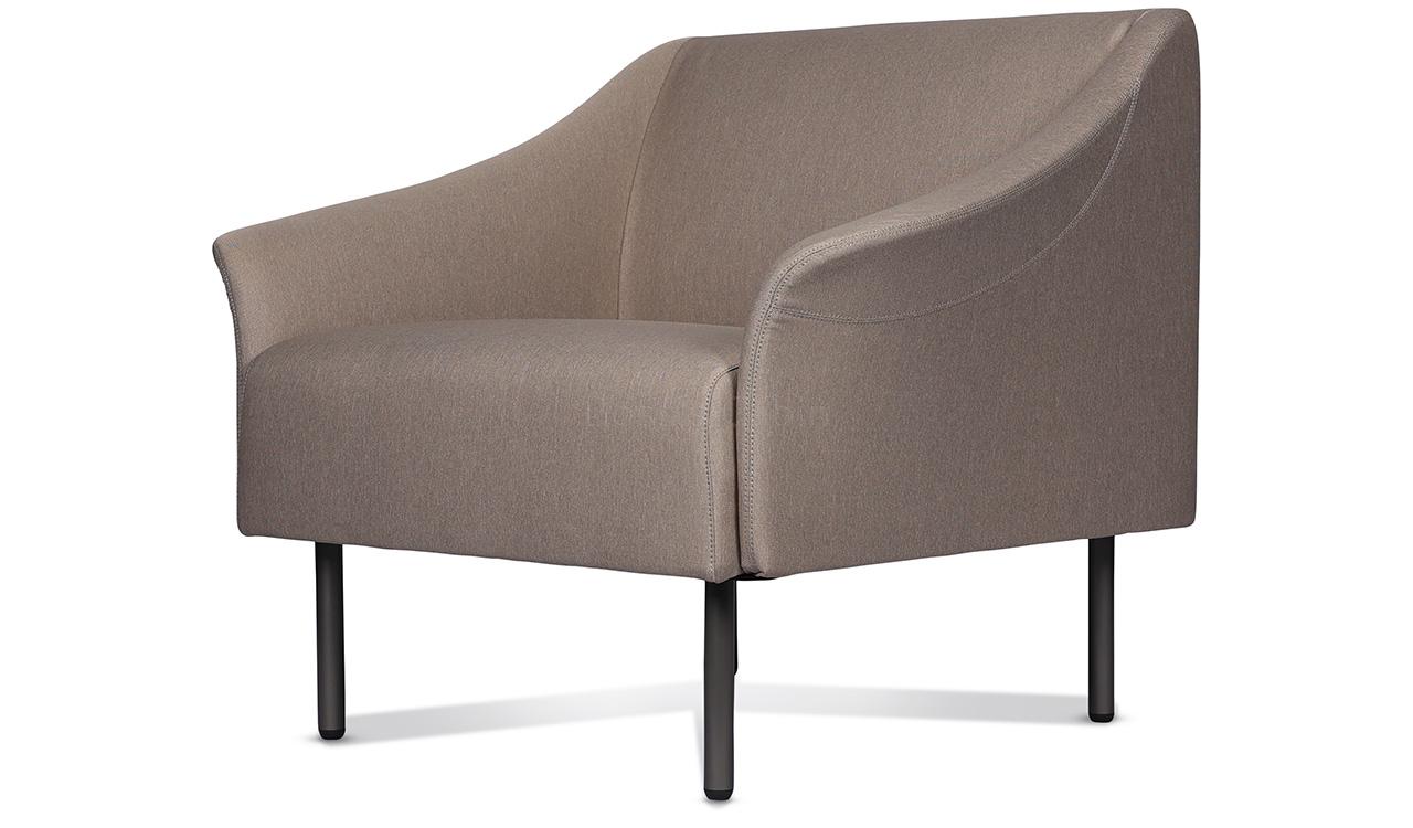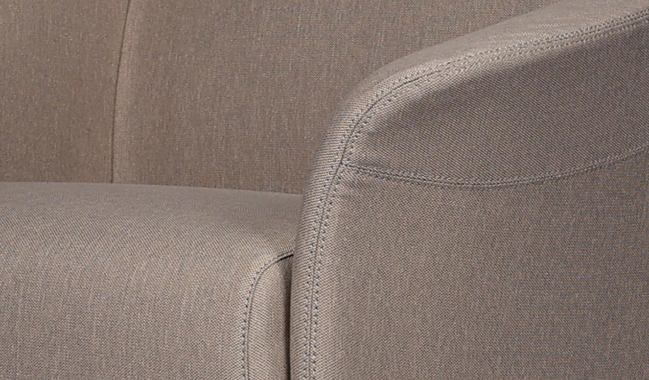 A compact one seater sofa in mushroom brown fabric upholstery. Designed for small spaces it can fit anywhere without taking up too much space and yet provide comfortable seating. Upholstered in a choice of 100% polyester fabrics with multi-layer high density foam and solid wood/plywood Mortise & Tenon inner frame . Includes meteor gray powder coated steel legs. Ideal for modern office cabins, waiting areas, lobbies etc.