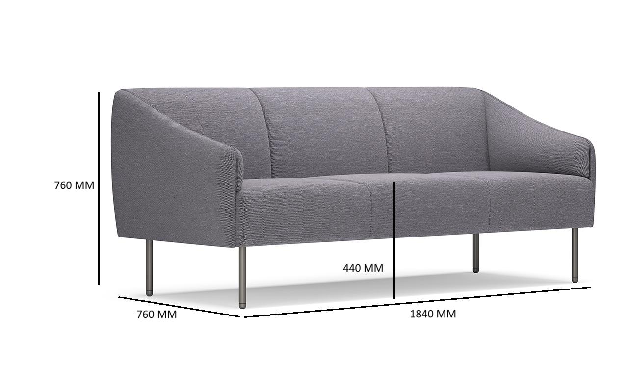 A compact three seater sofa in fabric upholstery. Designed for small spaces it can fit anywhere without taking up too much space and yet provide comfortable seating. Upholstered in a choice of 100% polyester fabrics with multi-layer high density foam and solid wood/plywood Mortise & Tenon inner frame . Includes meteor gray powder coated steel legs. Ideal for modern office cabins, waiting areas, lobbies etc.