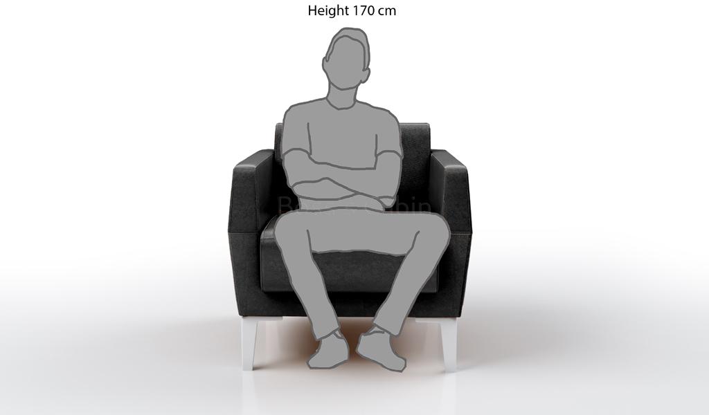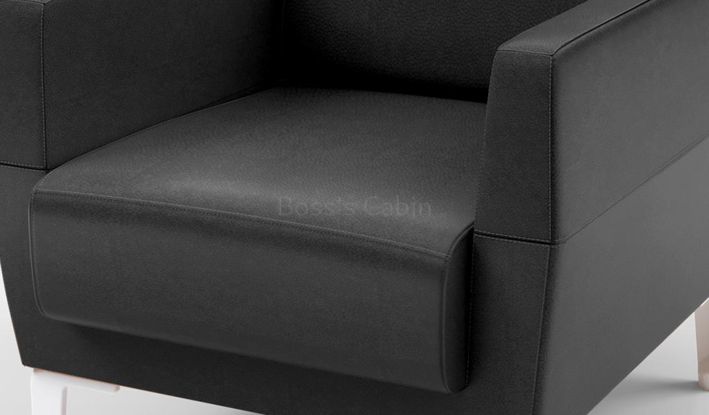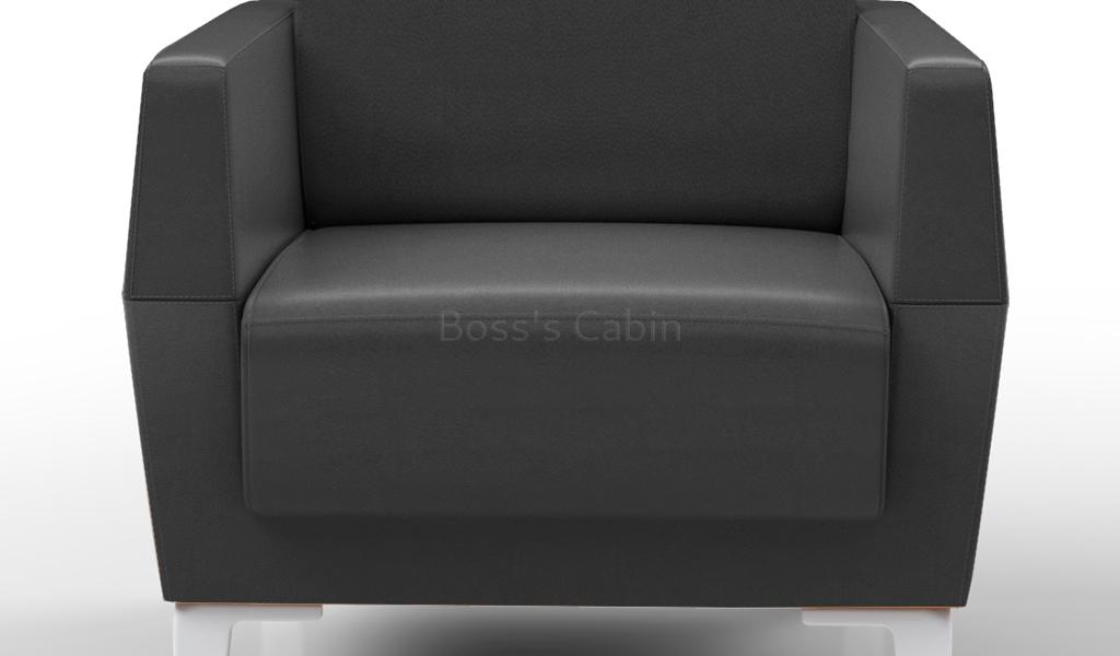 A compact and contemporary one seater office sofa that can fit anywhere without taking up too much space and yet provide comfortable seating. Upholstered in black color artificial leather with multi-layer high density foam and solid wood/plywood Mortise & Tenon inner frame . Includes white color metal legs in powder coated finish. Suitable for small office cabins and waiting areas.