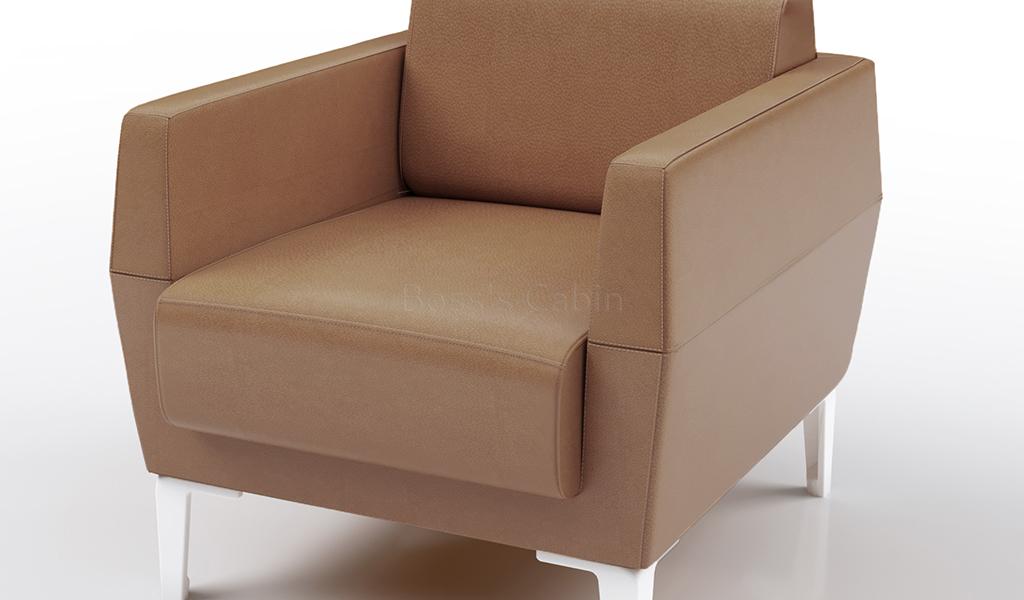 A compact and contemporary one seater office sofa that can fit anywhere without taking up too much space and yet provide comfortable seating. Upholstered in tan color artificial leather with multi-layer high density foam and solid wood/plywood Mortise & Tenon inner frame . Includes white color metal legs in powder coated finish. Suitable for small office cabins and waiting areas.