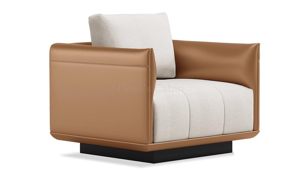 A contemporary one seater office sofa in breathable water based PU leather & fabric upholstery. Designed with six layers of foam with varying density achieve maximum comfort and durability. Manufactured with Durkopp sewing technology and aluminum alloy base the Taurus-T sofa comes with exceptionally fine finish. Available in one and three seater configuration its an ideal choice for MD cabins, plush lobbies and waiting areas. A modern sofa with urban Italian design aesthetics.
