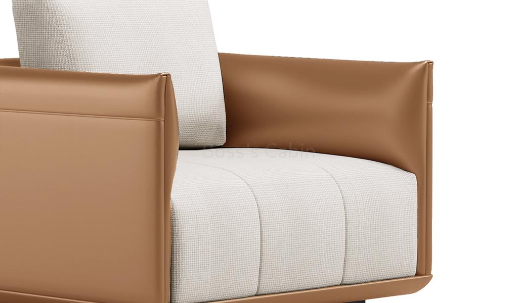 This premium office sofa looks best in tan PU leather and off white premium upholstery fabric.