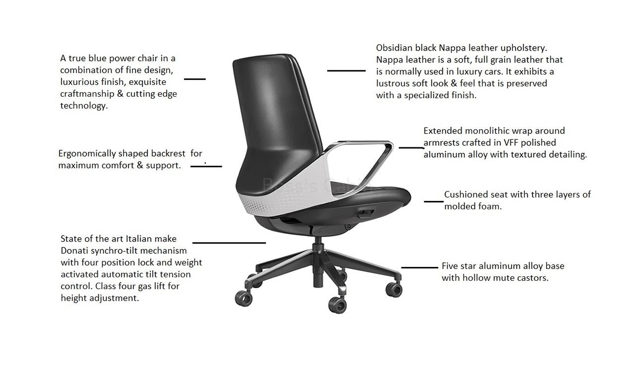 Obsidian black Nappa leather upholstery. Nappa leather is the highest grade of full grain leather that is known for its smooth and soft finish. Normally used in luxury car interiors it exhibits a natural & lustrous look and feel that is preserved with a specialized treatment. Its soft, smooth and pliable character makes it a superior choice for upholstery material while imparting the chair a feel of luxury that a discriminating user would look for.