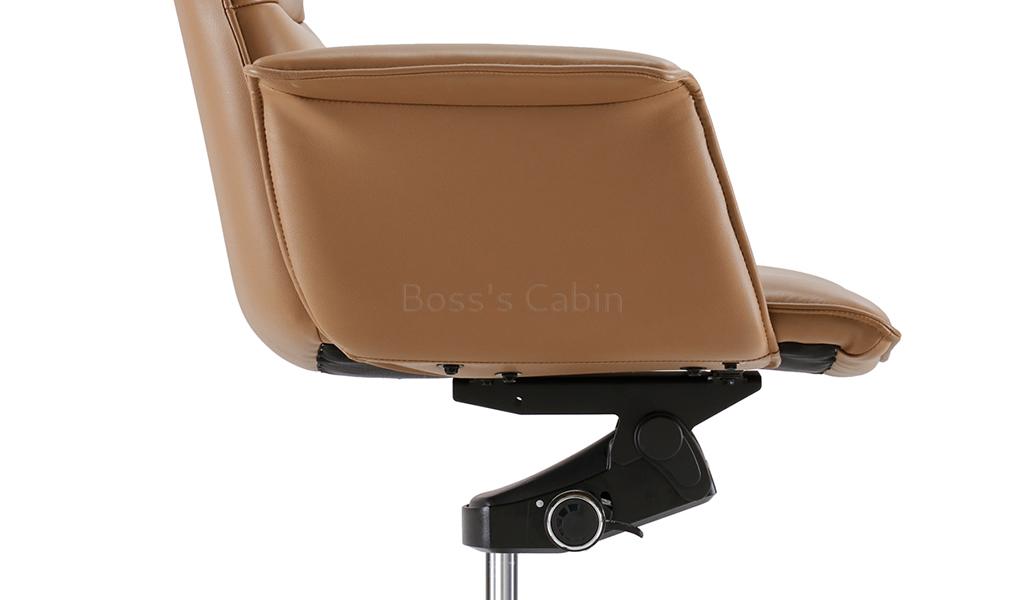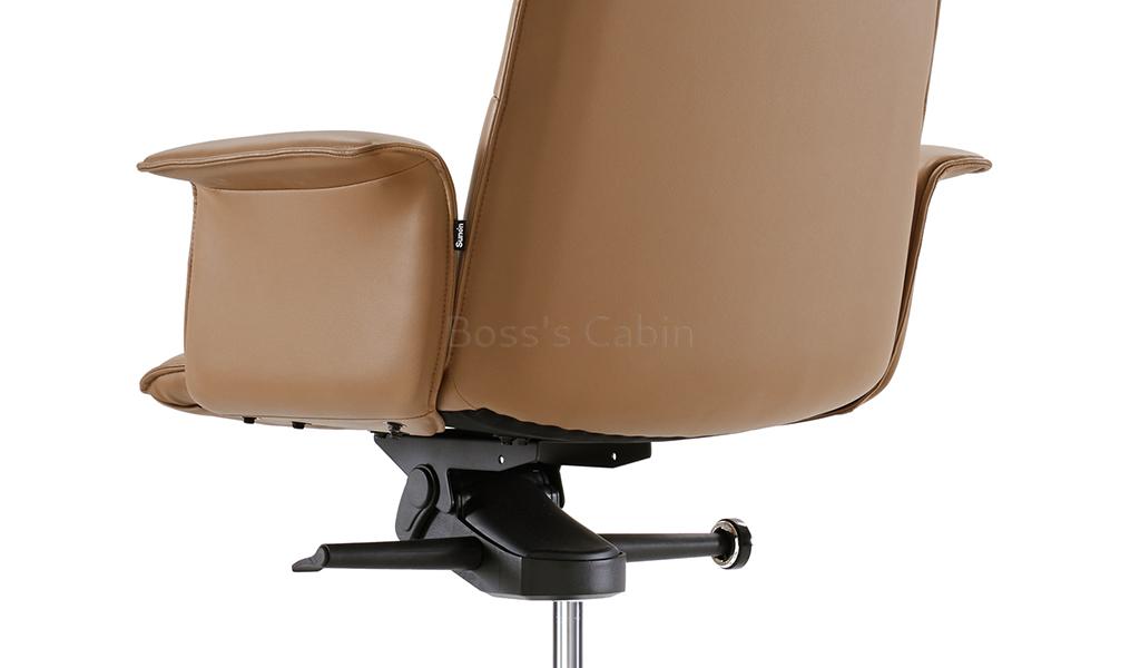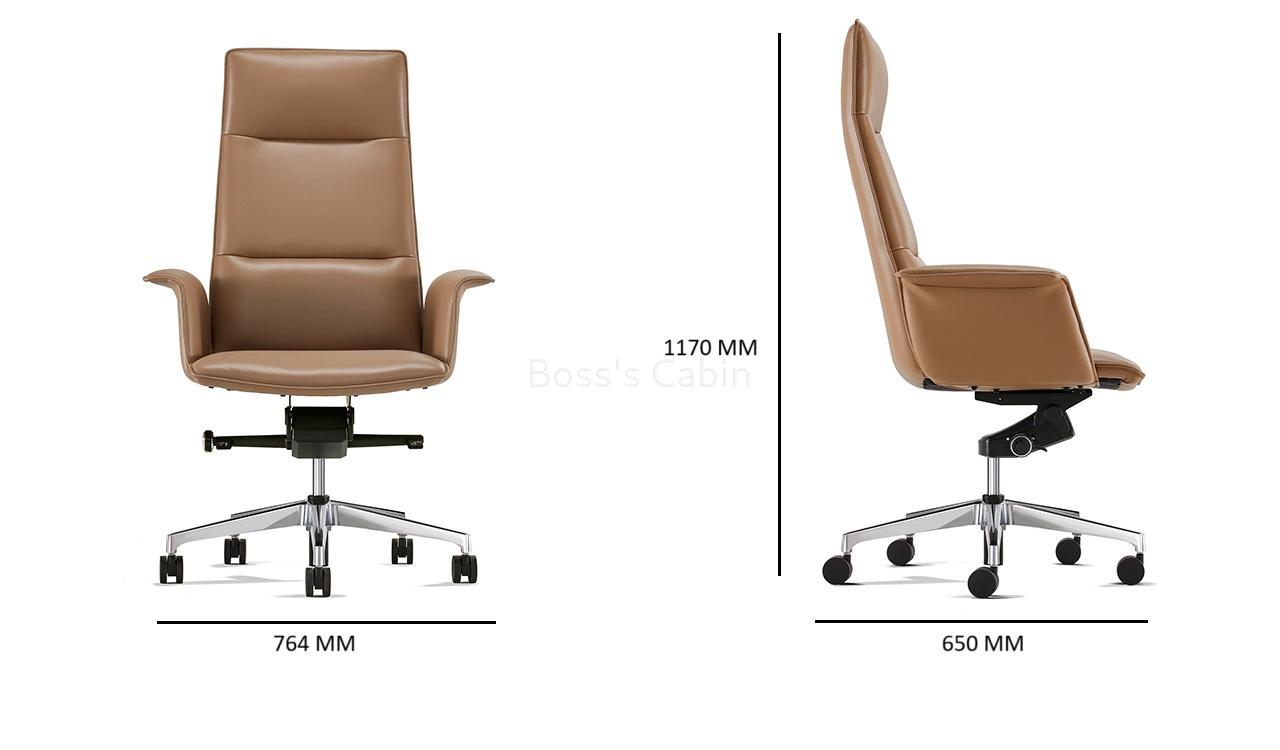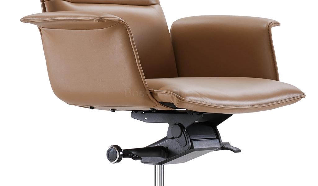 This is a premium general use high back office chair in coffee brown leather with advanced ergonomic features. Contact surface in genuine leather, backside in water based PU leather. Recommended for intensive use 6 to 8 hours per day. Easy to operate high back multi-function office chair Premium leather upholstery with slim edge everted armrests. Knee tilt KTG mechanism and tilt tension control. Knee tilt helps keep proper balance between your torso and provides superior tilting comfort. Multi-position locking. Allows you to lock the chair at four tilt positions. Pneumatic one touch seat height adjustment Heavy duty aluminum alloy base with nylon castors for easy mobility and lasting durability. Slim design, long and graceful lines and balanced proportions to complement a modern office.