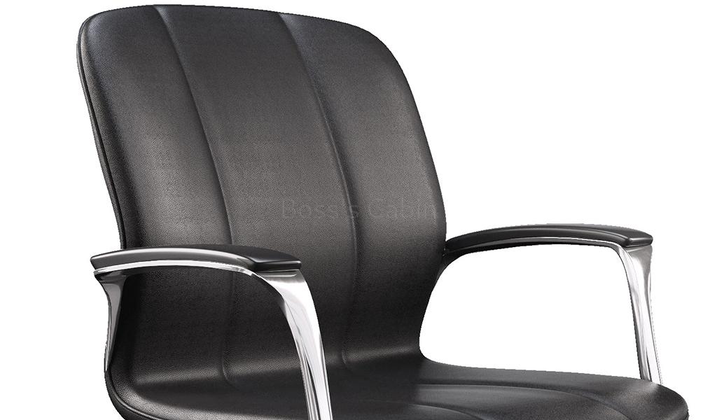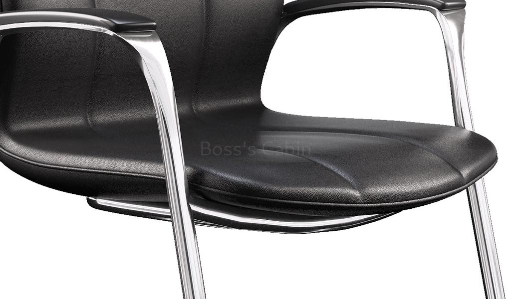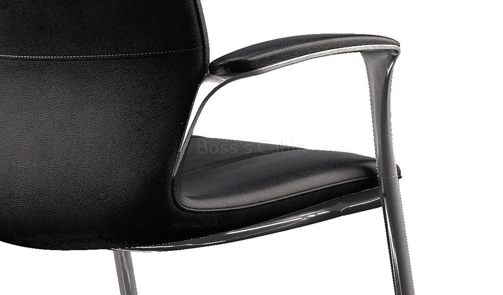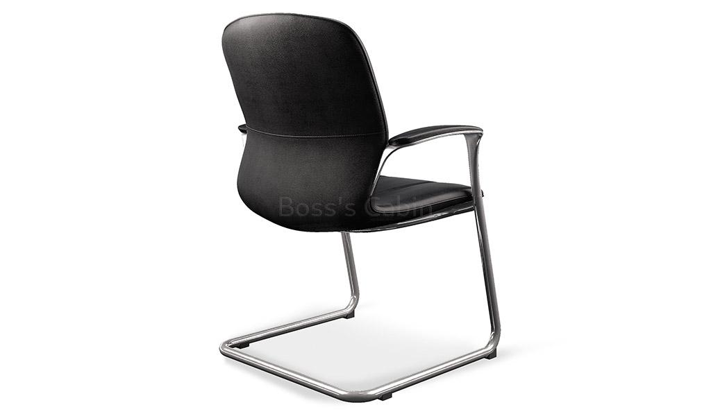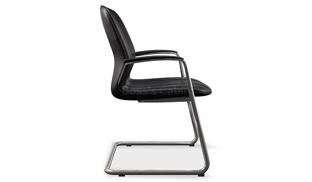 A medium back fixed base visitor chair in black artificial leather upholstery. Recommended for intensive use 6 to 8 hours per day. Medium back visitor's chair with fixed sled base. Soft artificial leather upholstery with high density foam. Ergonomically designed curved backrest. Soft armrests with padding for maximum comfort. Heavy duty sled base in chromed steel. Lumbar support feature. Provided firm support to your lower back and fits the natural curve of your spine.