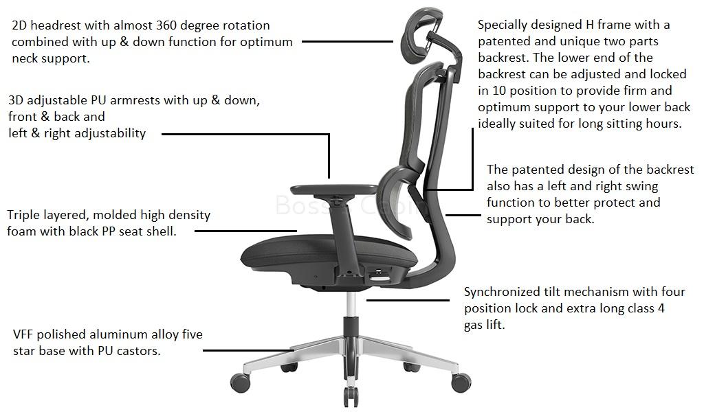 Designed with a patented break through ergonomic feature the H2 chair has a two part backrest. The lower end of the backrest can be adjusted and locked in 10 different positions to provide a snug fit and maximum lumbar support. Also features a 10 degree left & right swing function in the backrest, 3 way adjustable armrest, 2 way adjustable headrest and synchronized tilt mechanism with 4 position lock. A premium chair with superior build and ergonomics ideal for long sitting hours. View Chair Manual Video