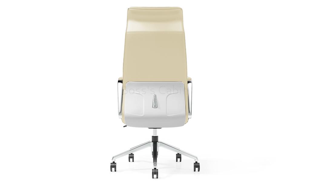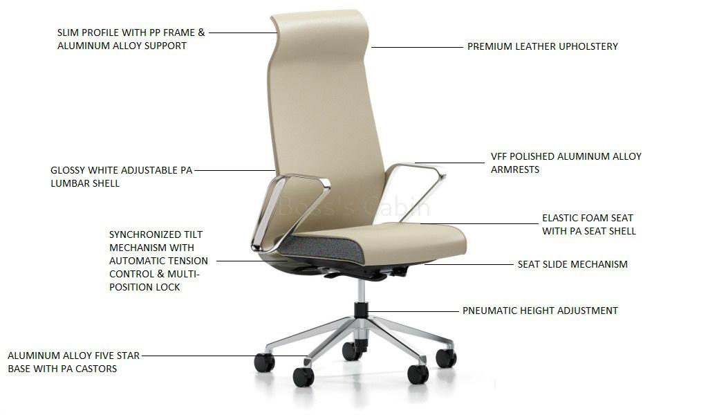 A feature packed high back chair made with fine leather and state of the art engineering and ergonomics. Rich leather upholstery, slim design, white back panel with adjustable lumbar support, polished aluminum alloy armrests, synchronized tilt mechanism, multi-position locking, height adjustment, seat depth adjustment with seat slide mechanism, polished aluminum base and nylon castors.