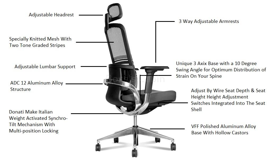 Donati weight activated synchronized tilt mechanism. The chair comes with the best in class, Italian make, mechanism. It regulates the force needed for reclining the chairs based on a user’s body weight. Combined with the chair’s three point coordinated control system it ensures an optimum balance between the torso and legs. It effectively distributes the strain evenly through out your lower body when sitting for long hours.