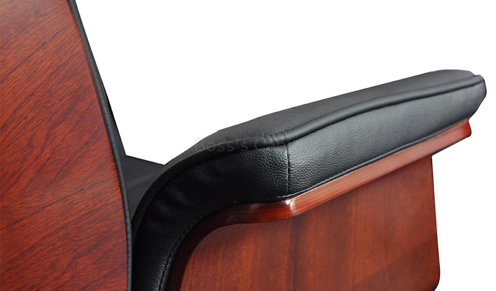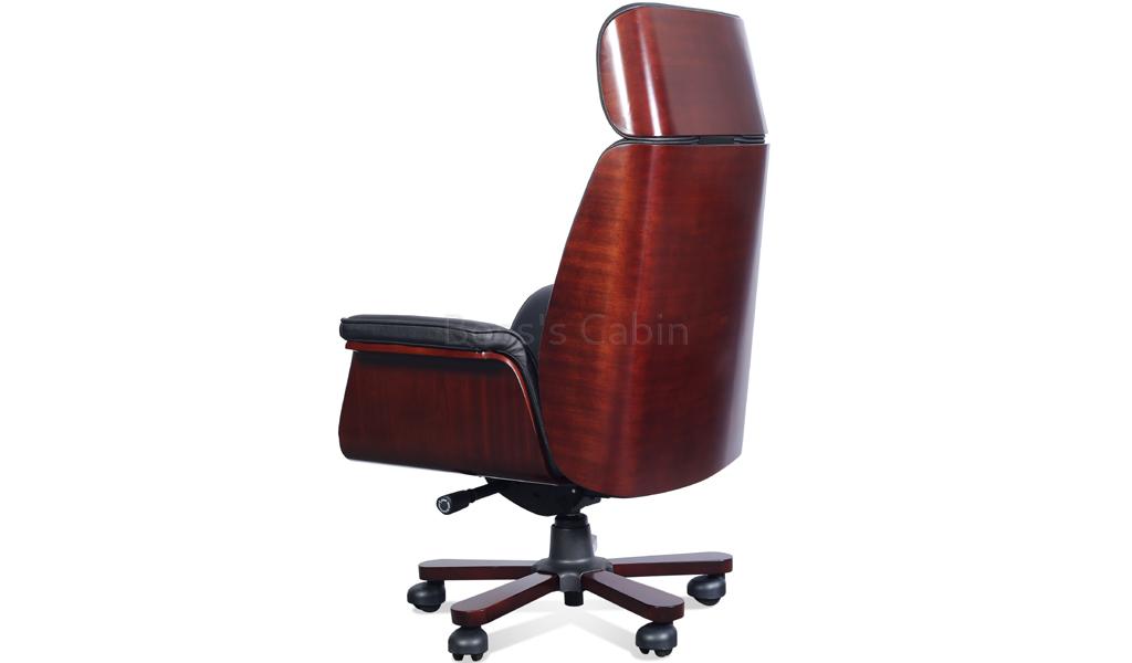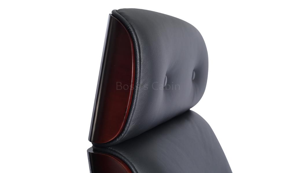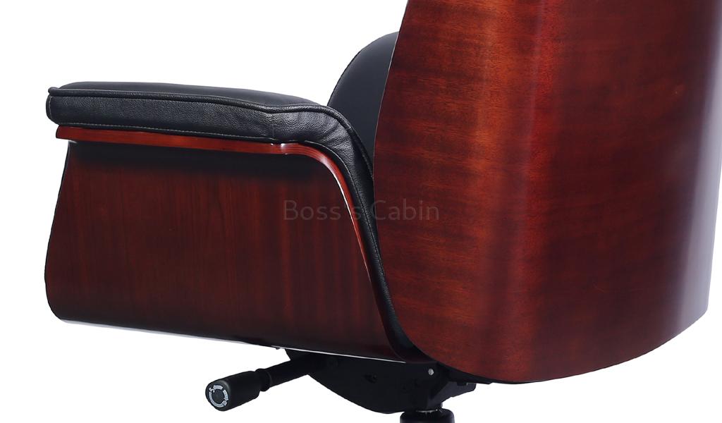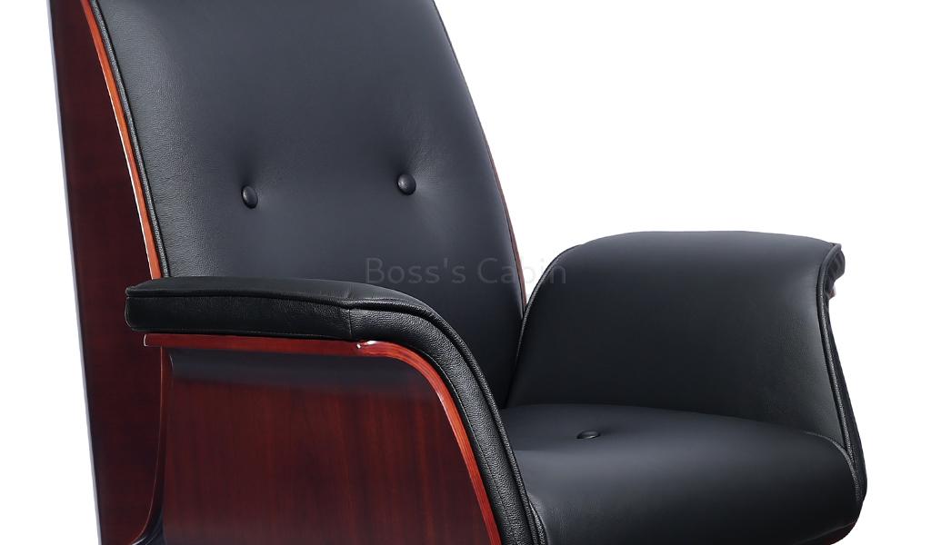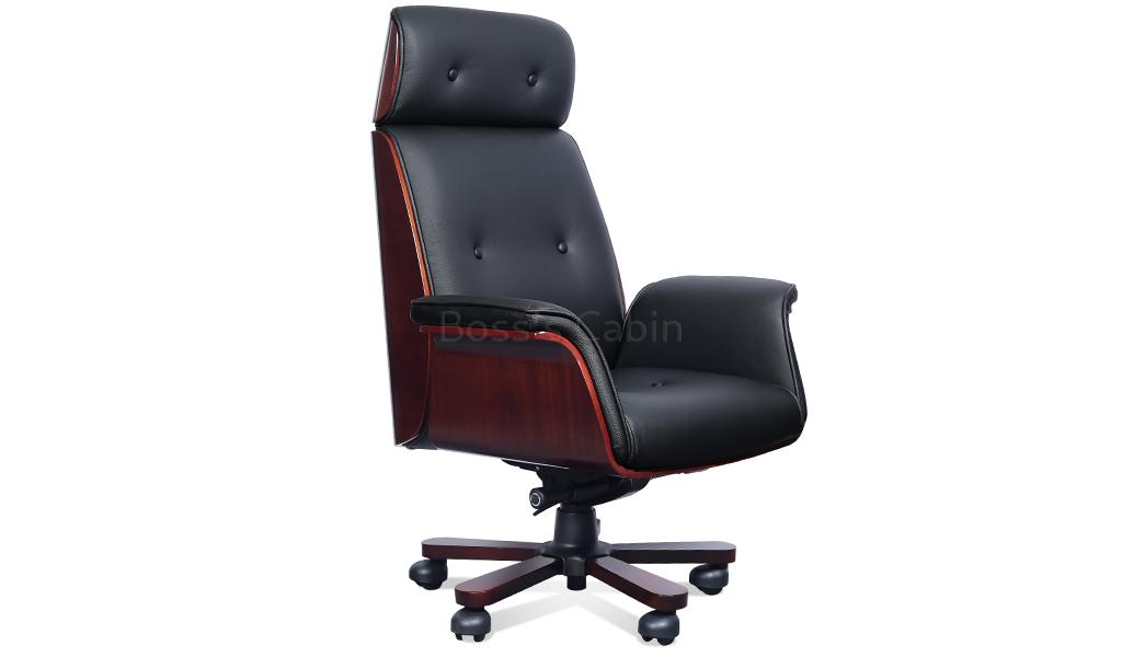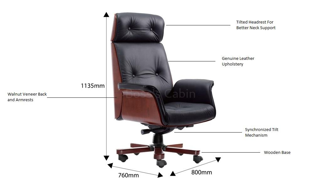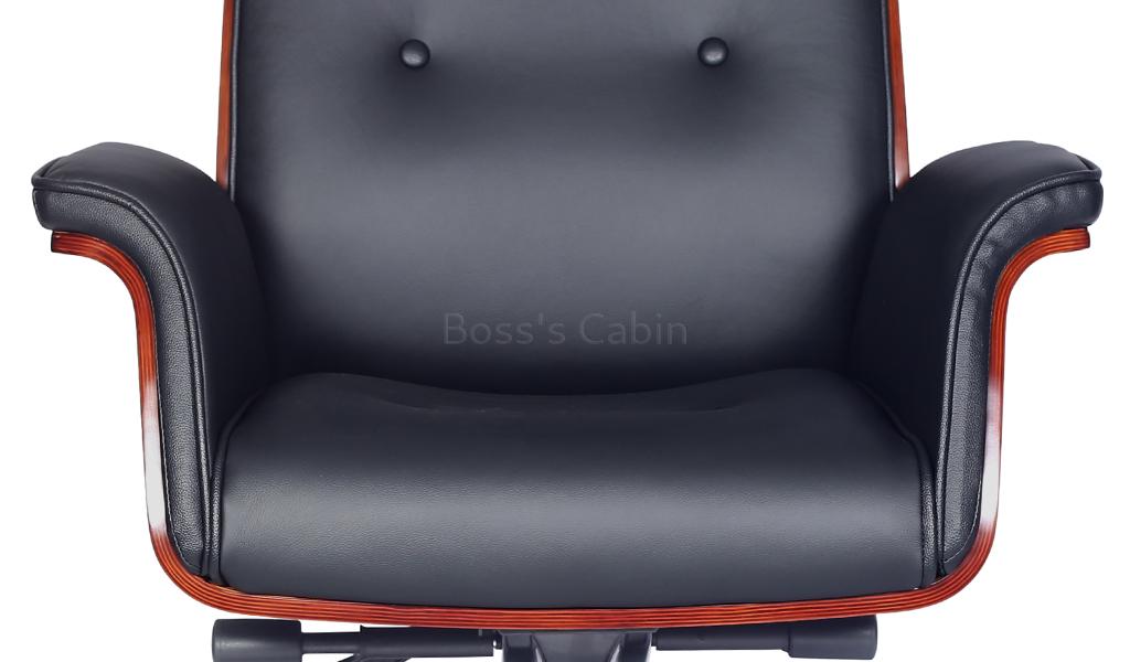 A classic, chesterfield office chair in black leather and veneer. Includes advanced ergonomic features recommended for intensive use 6 to 8 hours per day. Easy to operate high back multi-function office chair Genuine tufted leather upholster with molded plywood frame with natural wood veneer. Synchro tilt mechanism and tension control. Leather upholstered & molded, veneered armrests. Pneumatic one touch seat height adjustment Heavy duty wooden base with nylon castors for luxurious look and lasting durability