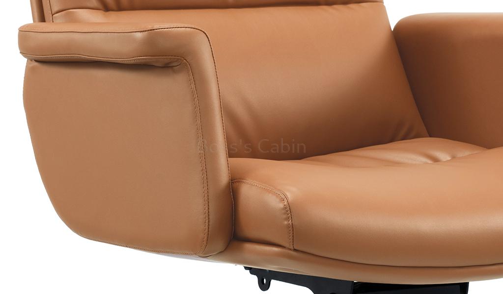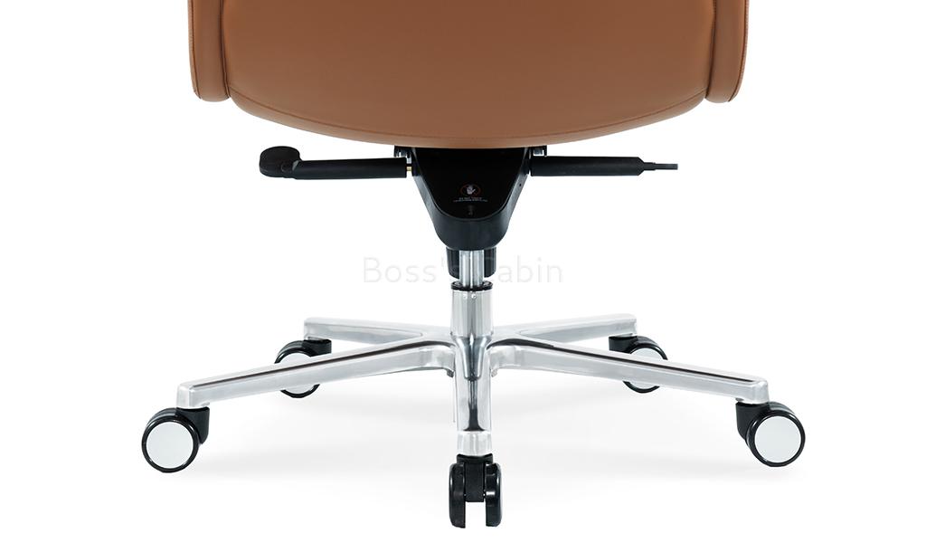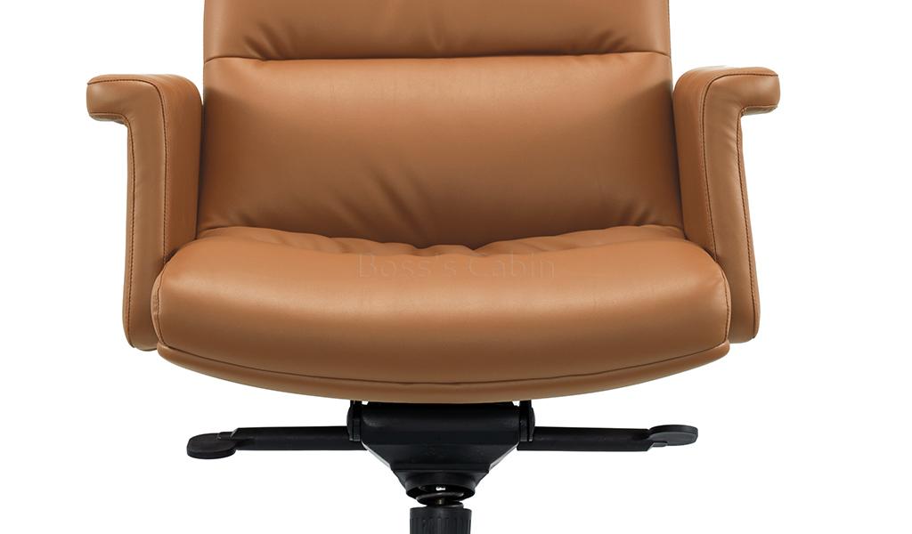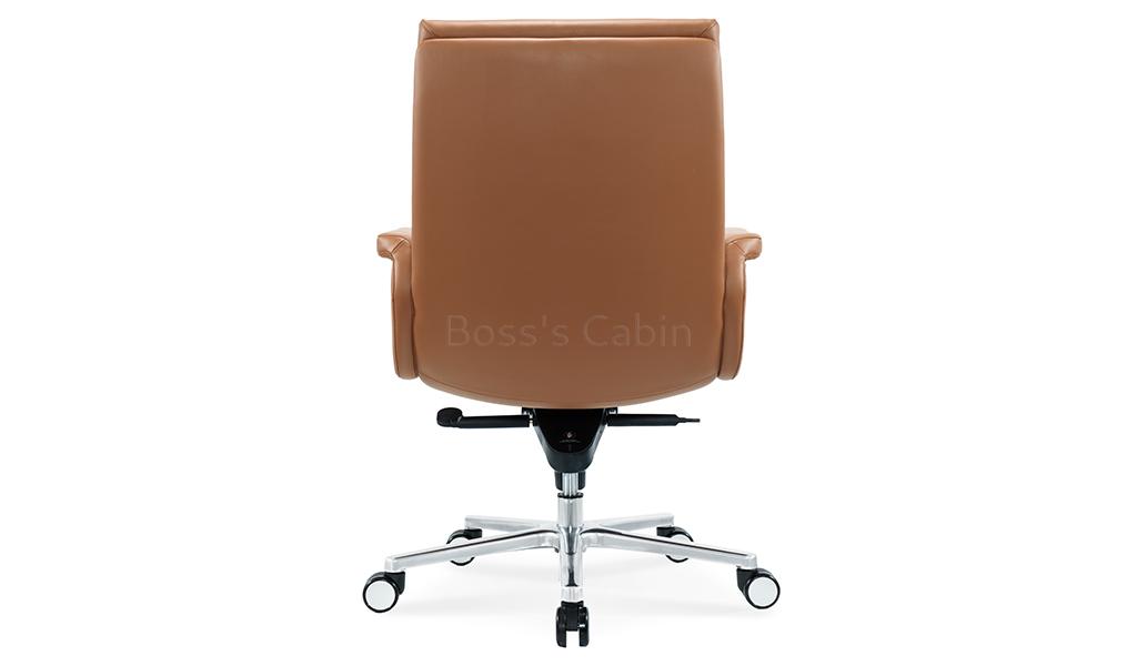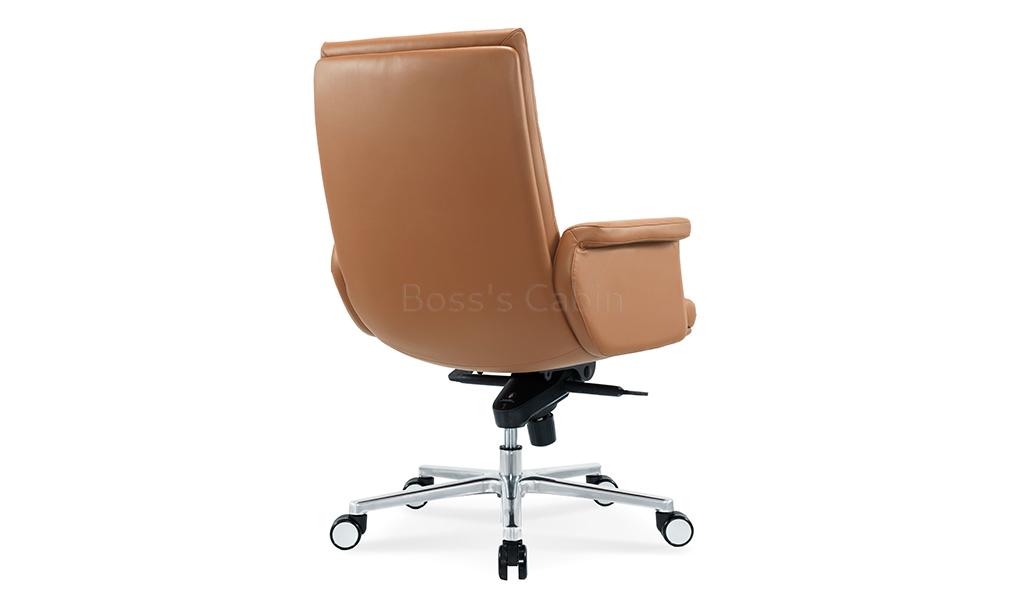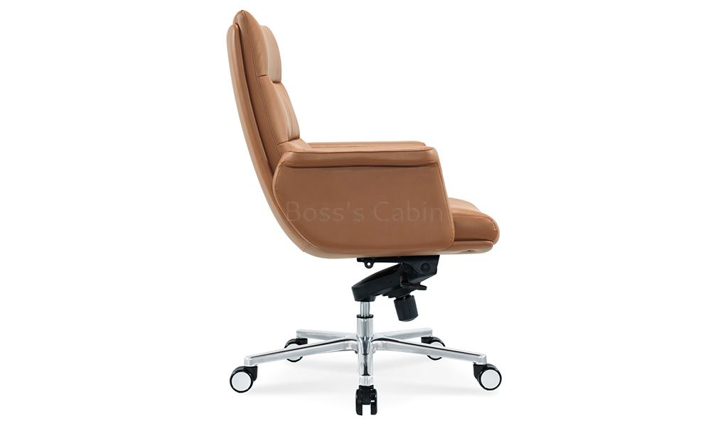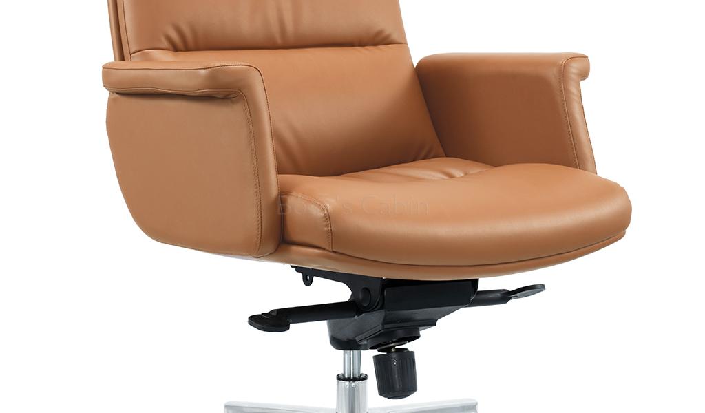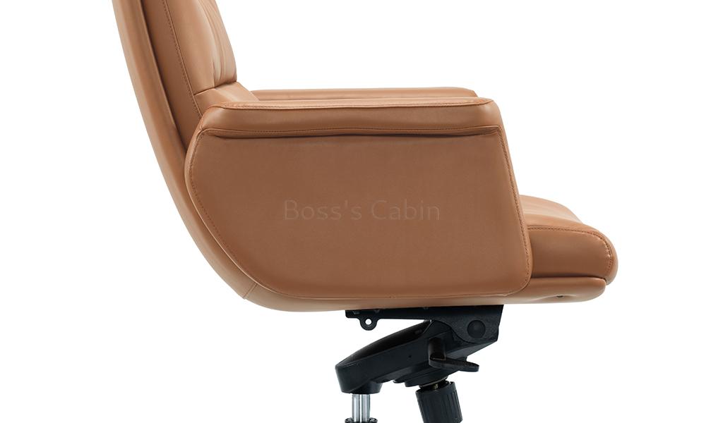 The Omega mid-back office chair is upholstered in Golden tan water-based PU leather, offering a refined, eco-friendly finish. Built on a sturdy wooden understructure, it features an extra-thick cushioned seat and back for superior comfort. Fully upholstered armrests flare outward at the top, enhancing both arm support and seating space. Equipped with a synchronized tilt mechanism, pneumatic height adjustment and a reinforced aluminum alloy base with smooth nylon castors, it delivers both comfort and lasting performance. View all options from the Omega series