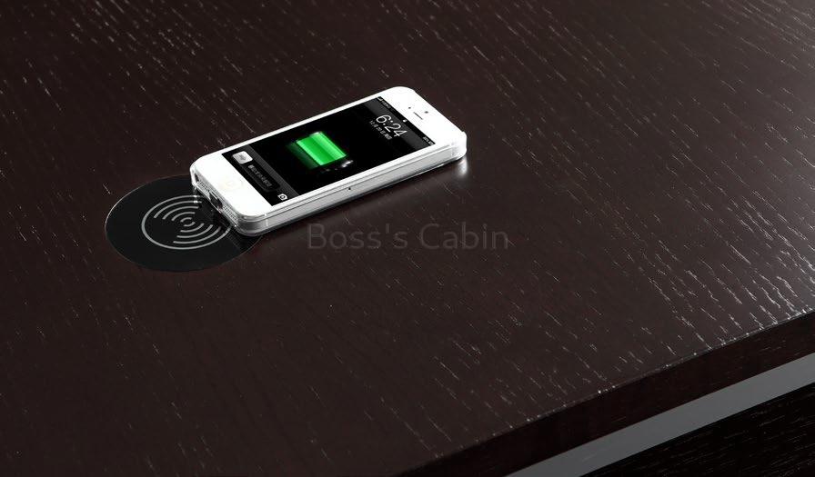 Veneer finished office desk with embedded wireless charger on desktop, side cabinet, mobile pedestal and automated wirebox with voice, data and power ports.
