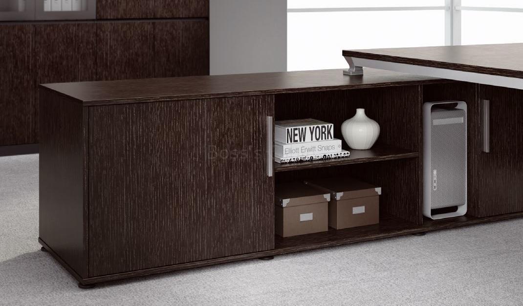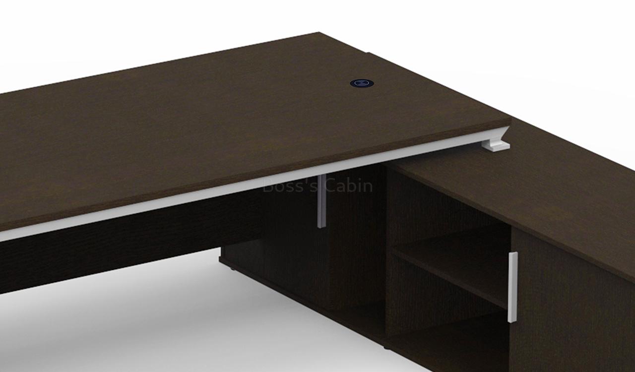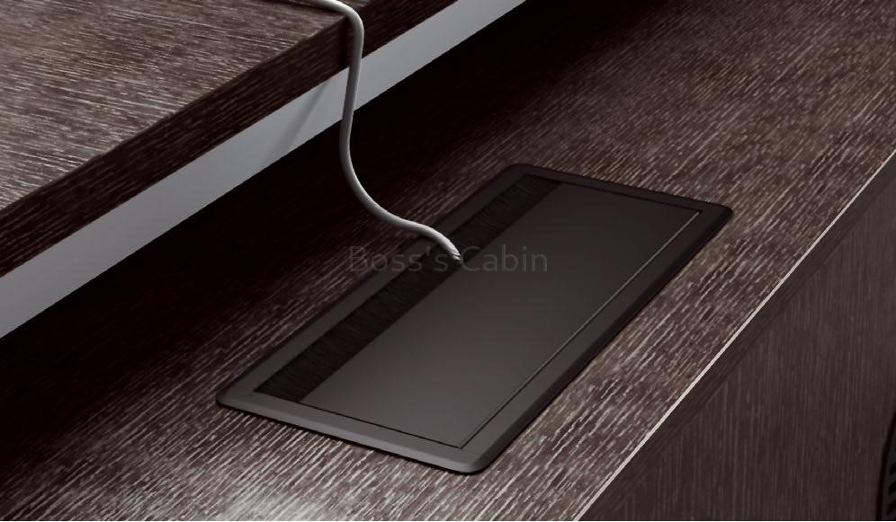 A large office desk with inbuilt wireless charger on the desktop. Finished in rich open grain dark oak veneer. The base of the work top is supported with solid anodized aluminum frame with a stylish profile. Comes with side credenza, three drawer pedestal, FGV soft closing hinges and inbuilt wire box with power, internet and telephone sockets.