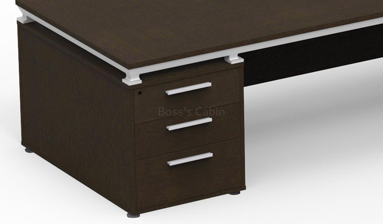 A dark oak, 9 feet office table with wireless charger on tabletop. Includes a side cabinet & three drawer mobile pedestal with inbuilt wire management. Designed by Red-Dot award winning team of German architects this solid wood finish table is built with top grade MDF and veneer for lasting durability, natural feel and luxurious looks. It is part of the Eazy series from which you can choose an entire range of matching cabinets, smaller tables, conference tables etc to create a complete office. Go to our catalog section to download the entire catalog.