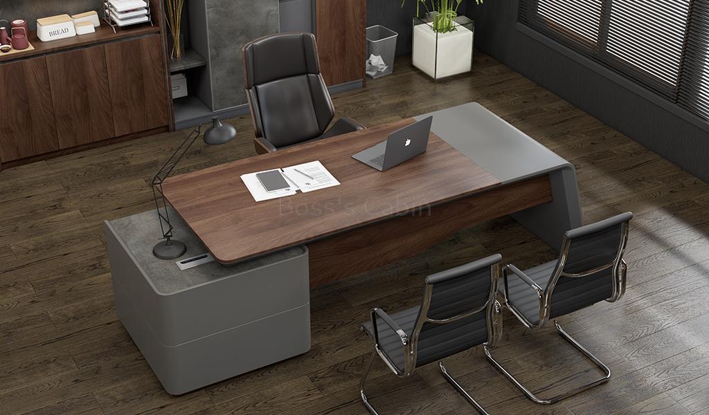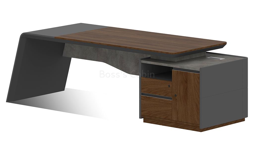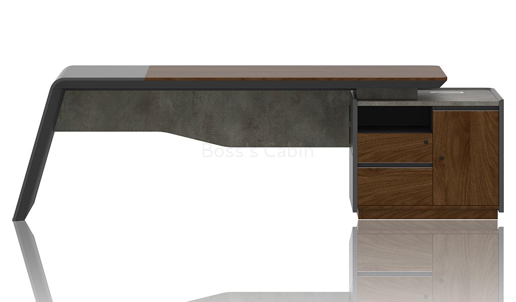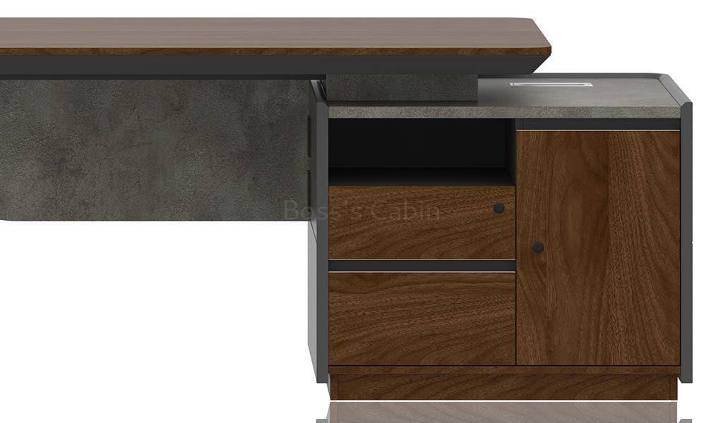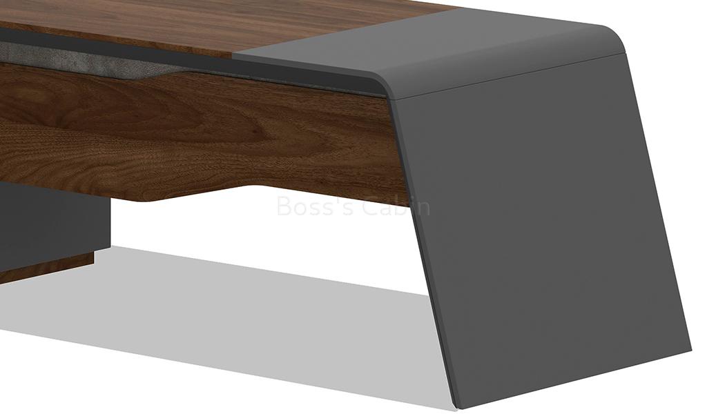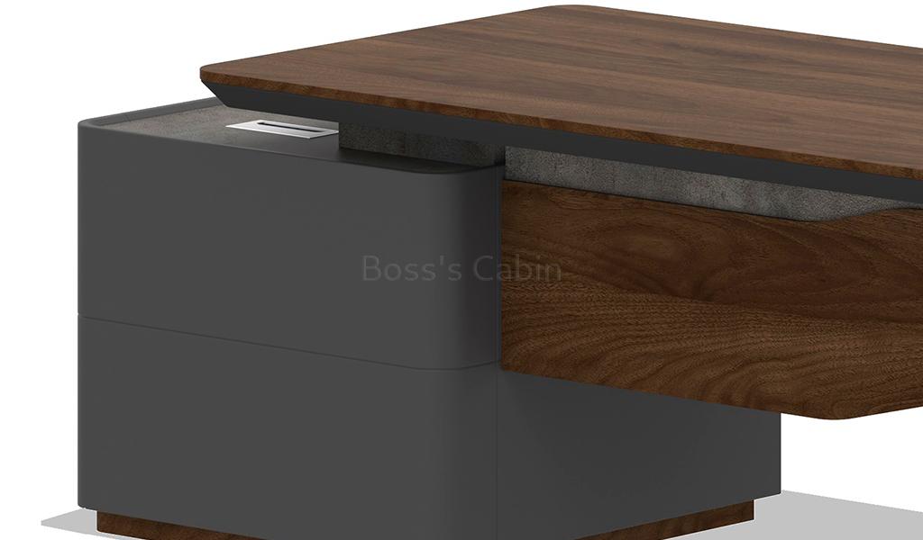 Office desk in 8.5 feet width with storage pedestal made with environment grade engineered wood and walnut laminate. The E1 grade MDF is a highly durable material and a world standard for premium office furniture while the walnut laminate is from our carefully selected range of premium laminates with consistent color and grain structure.
