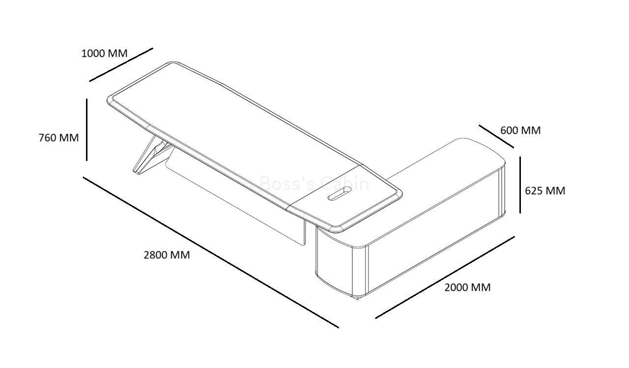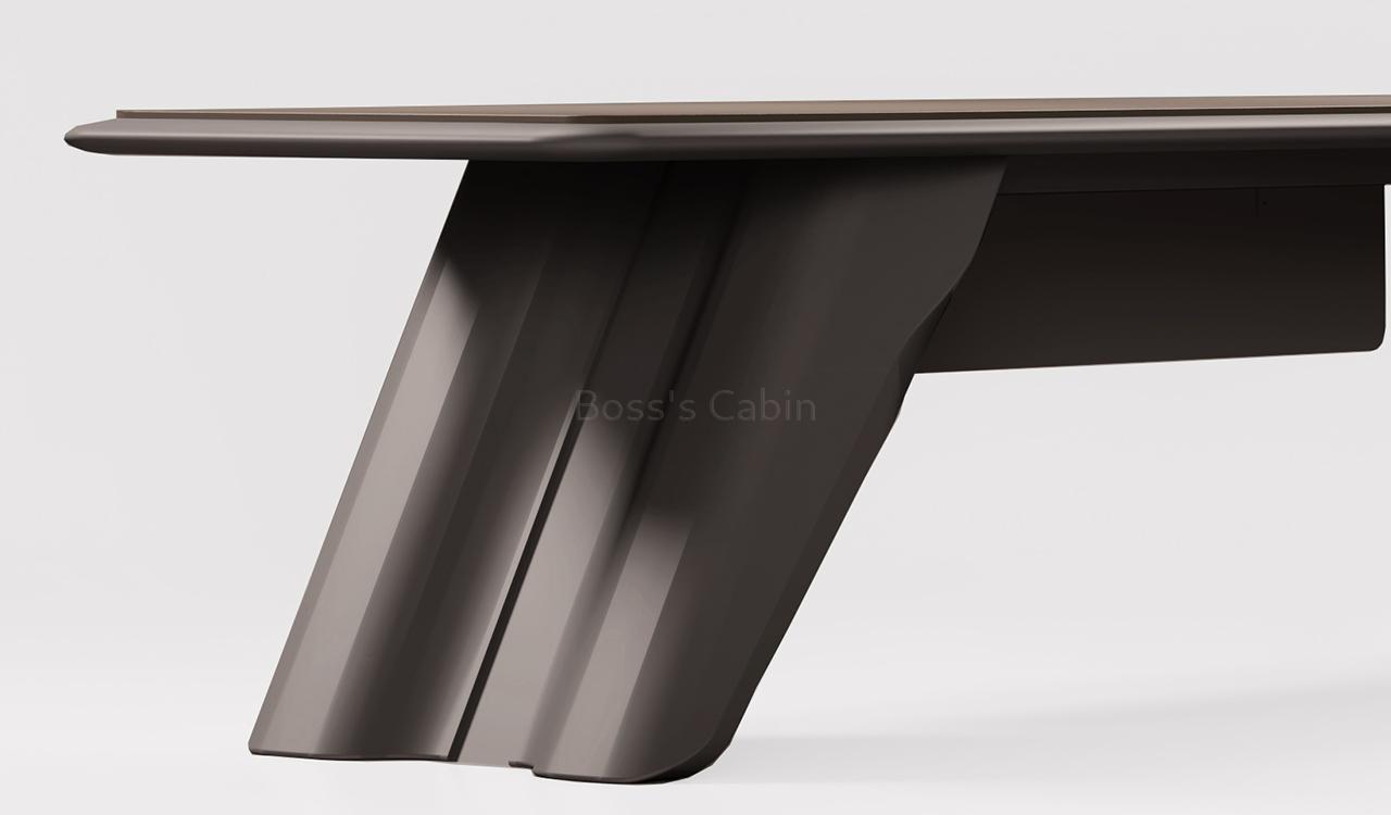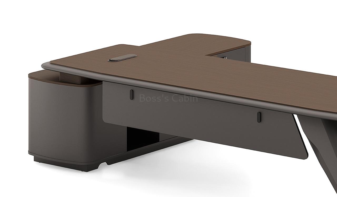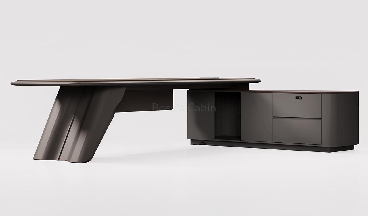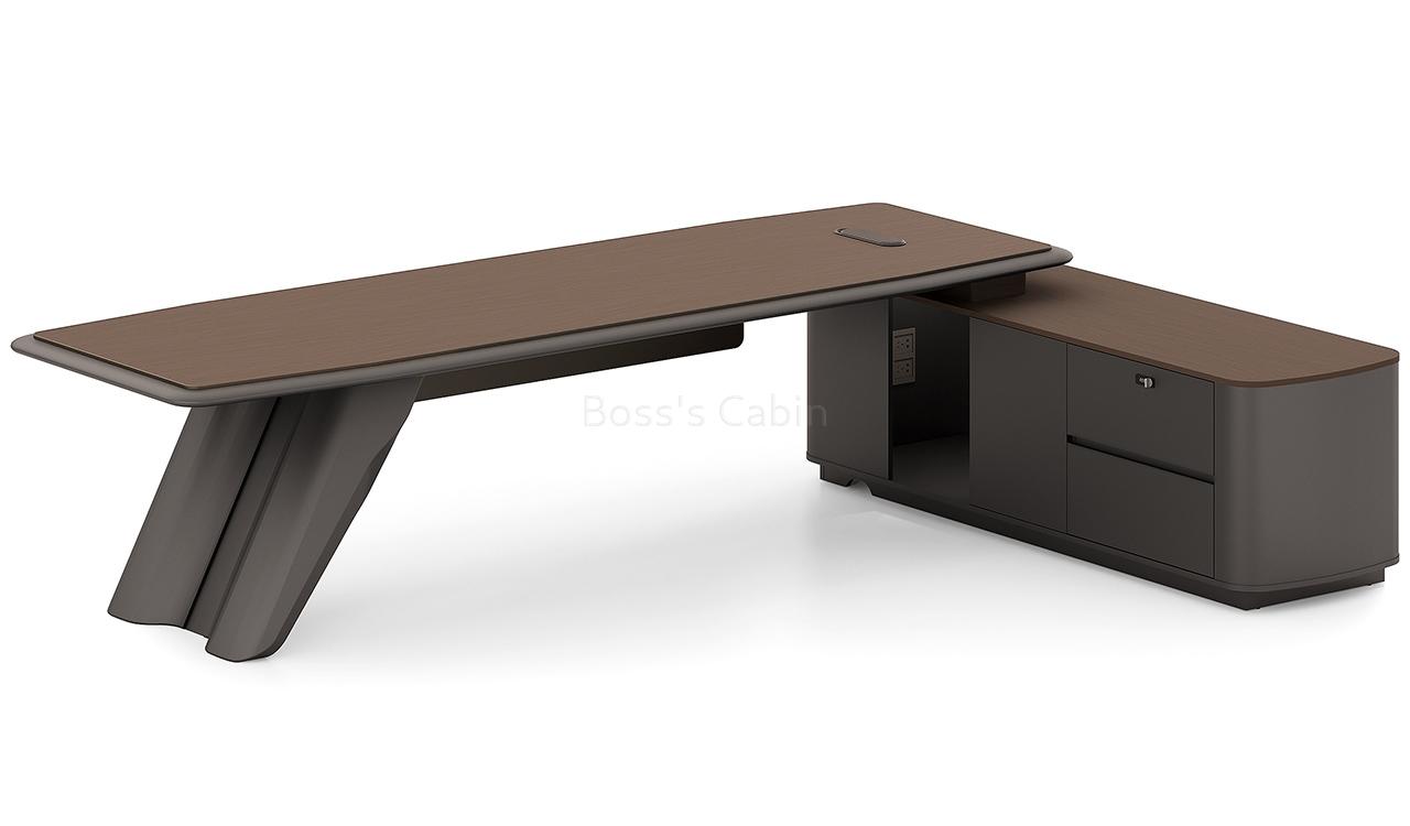 A modern office desk featuring a parametric, multi-dimensional slanted leg for contemporary interiors. It includes a rounded-edge side cabinet with number-locked drawers and swing-door storage. The dual-surface, two-tone top has rounded, chamfered edges for a smooth, dynamic look. A sleek grommet with power sockets ensures a clutter-free workspace. The asymmetrical modesty panel adds aesthetic balance. Ideal for cabins of 200 sq. ft. or more, this desk pairs seamlessly with all Prima series products for a cohesive office setup.