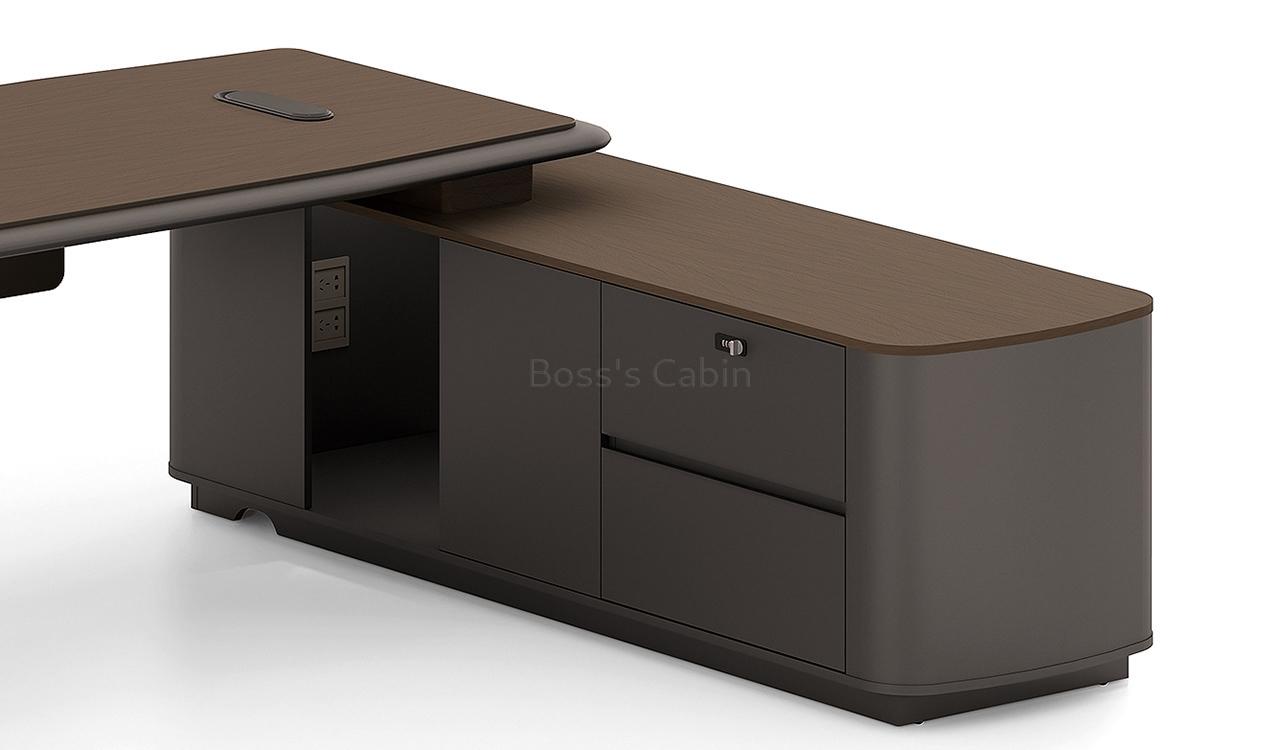 1. Dual tone tabletop in walnut & gray combination. 2. Side cabinet with swing door/open shelf & drawers with number lock. 3. Tabletop with integrated wire routing grommet.