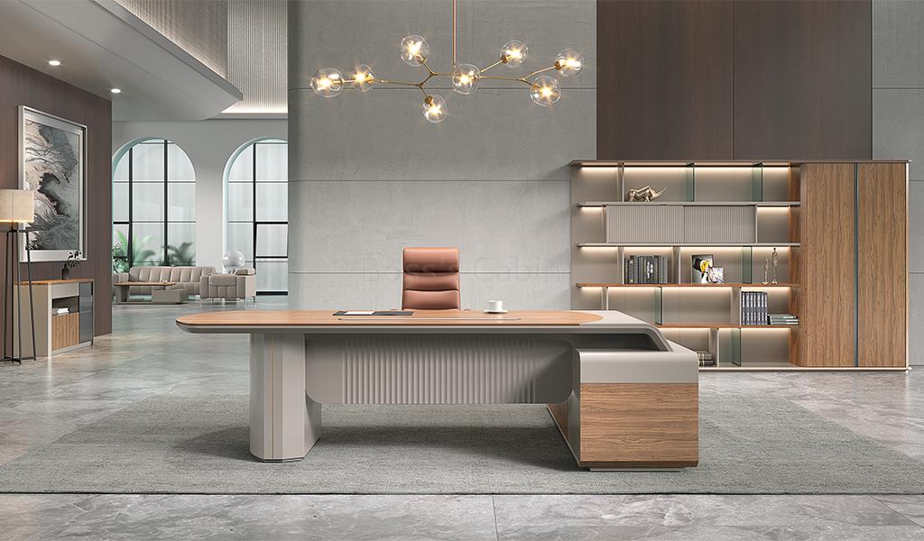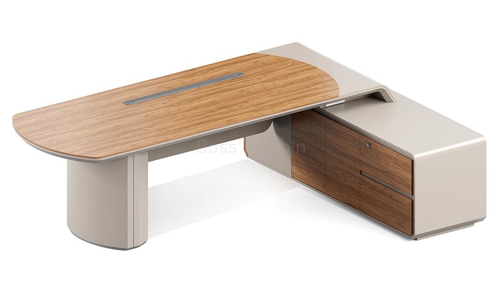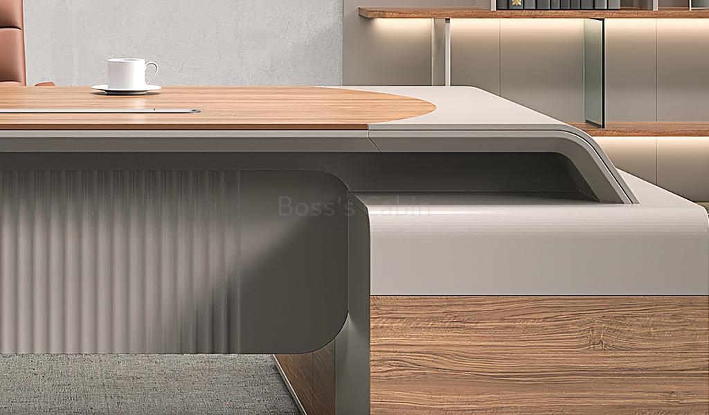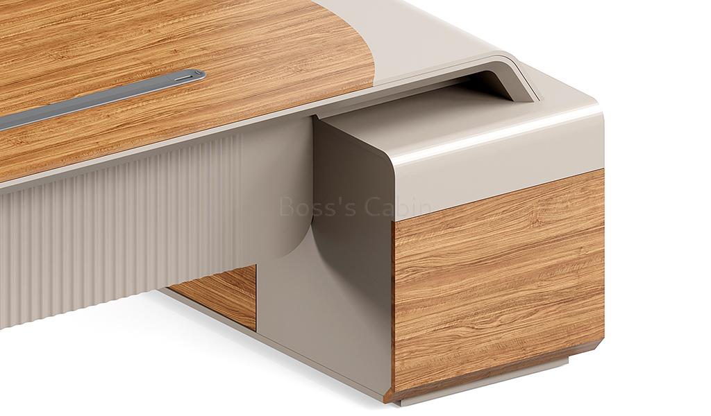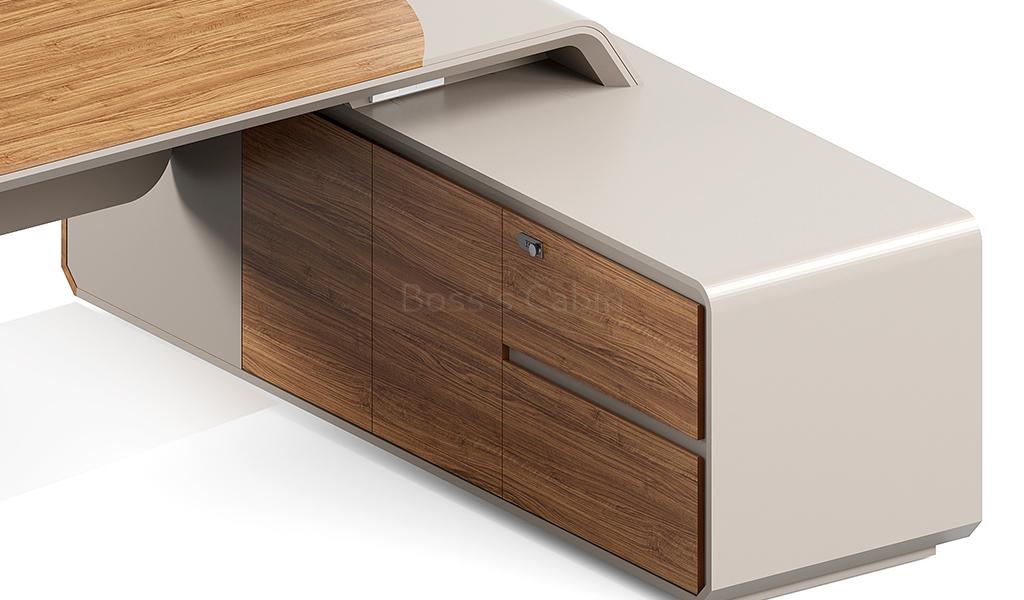 A large office table in rich sandalwood and seagull gray laminate, featuring a dual-tone beveled wrap over top with smooth, rounded corners. Includes a side cabinet with number-lock drawers, shelves, CPU space, and wraparound rounded edges & corners. A fluted modesty panel and integrated wire track with routing holes ensure clean cable management. Part of the Swan Series, ideal for cabins of 200 sq. ft. and above.   View Product Video