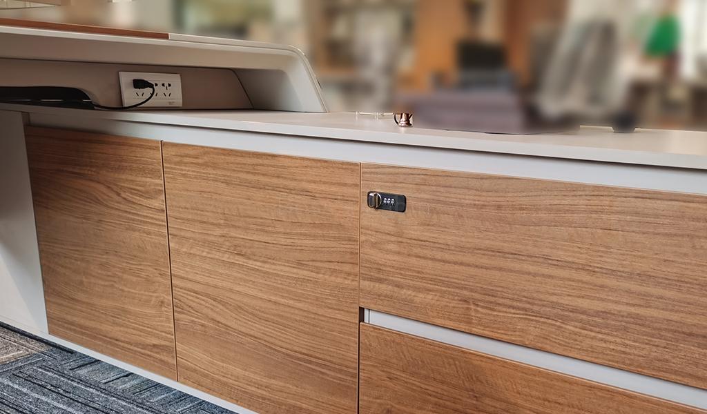 Desk, side cabinet with storage, modesty panel and inbuilt wire management for managing your data and power cables.