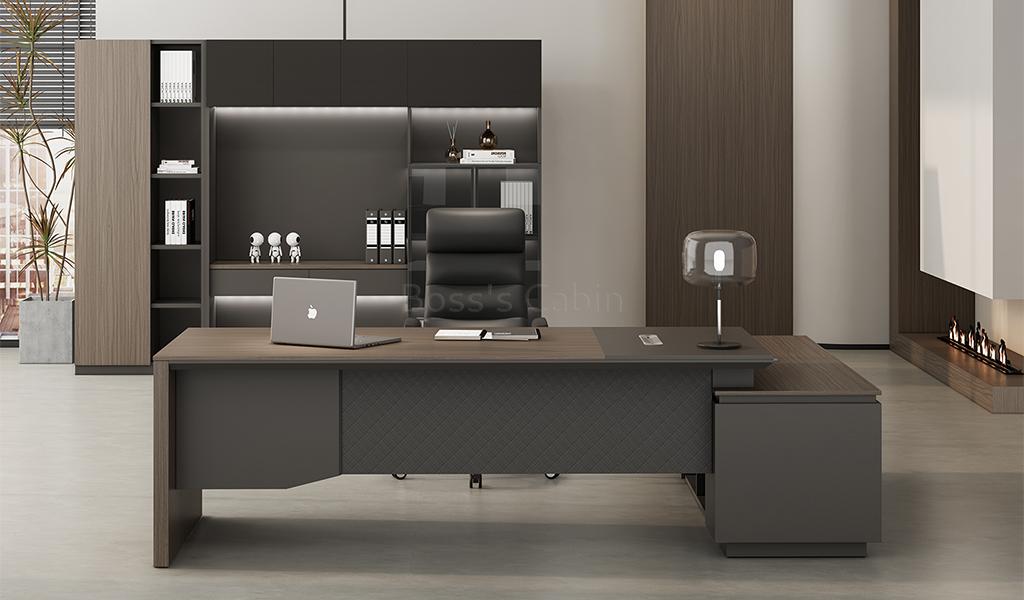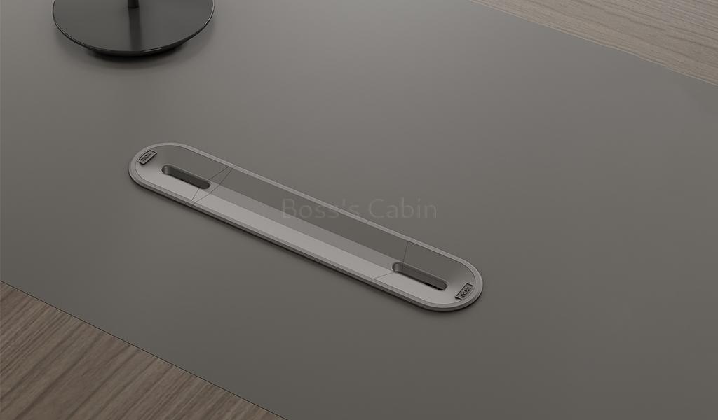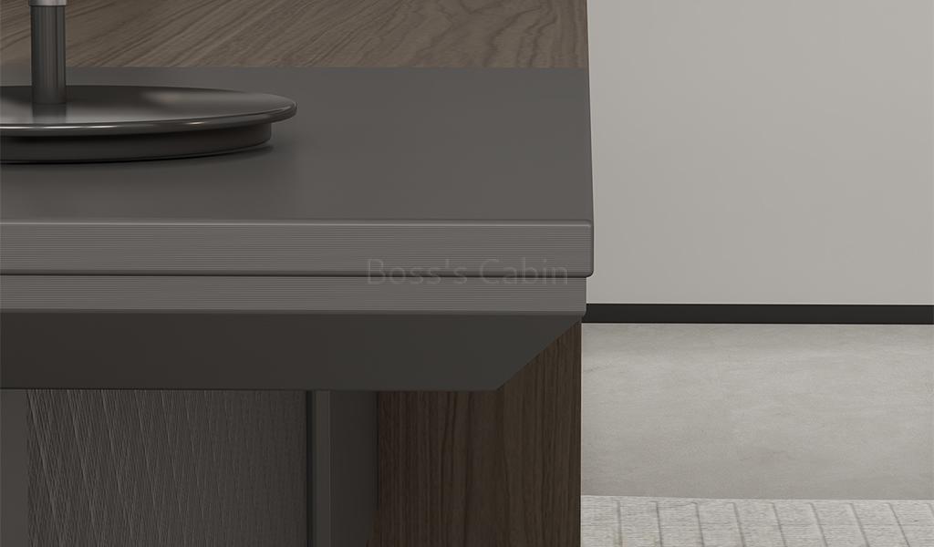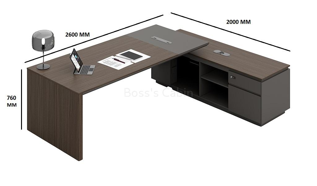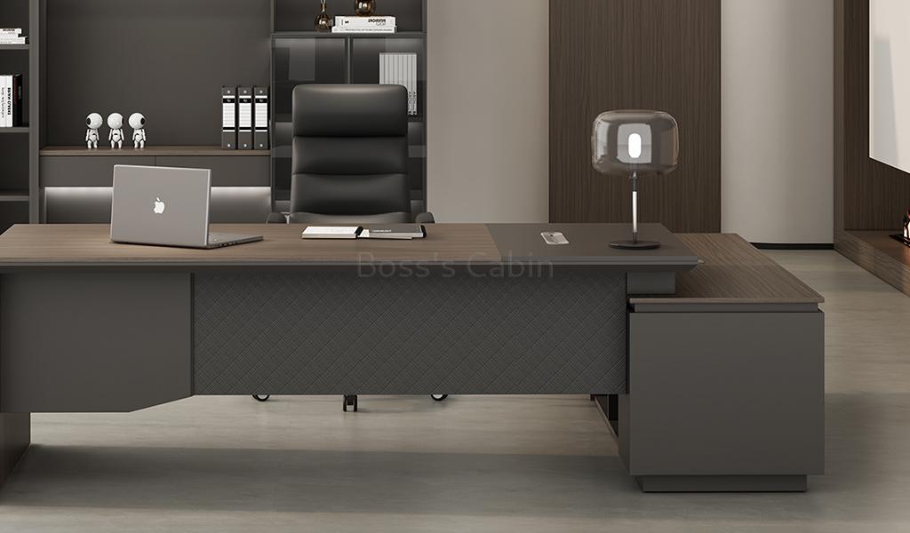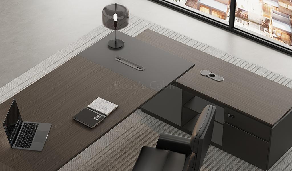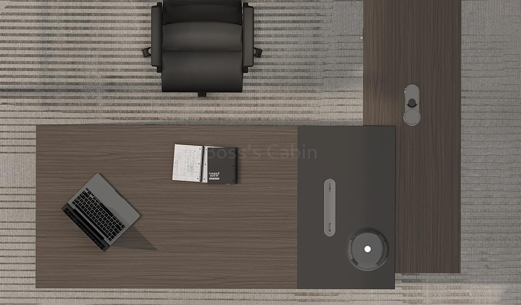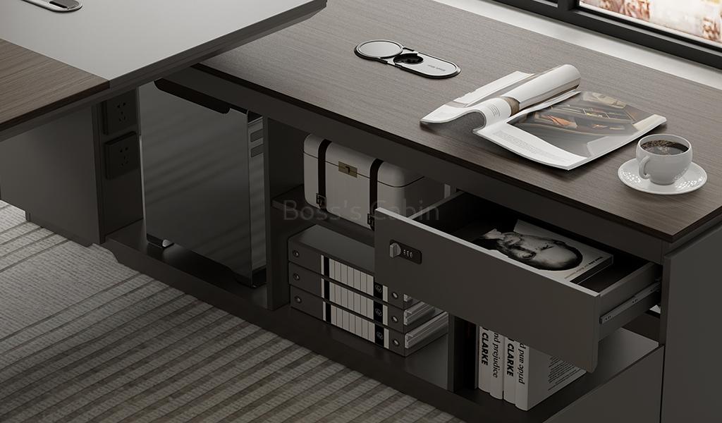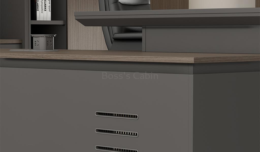 This modern, large-format office desk is designed on straight architectural lines. Its dual-tone tabletop in Asti Walnut and Advanced Gray laminate features inward chamfered edges and an integrated wire-routing grommet for a sleek, functional design. The side cabinet offers secure storage with a number lock and built-in wirebox for effortless cable management. A textured and solid gray modesty panel adds visual depth, completing the desk’s refined, professional vibe. Pairs seamlessly with all Vistra series products.