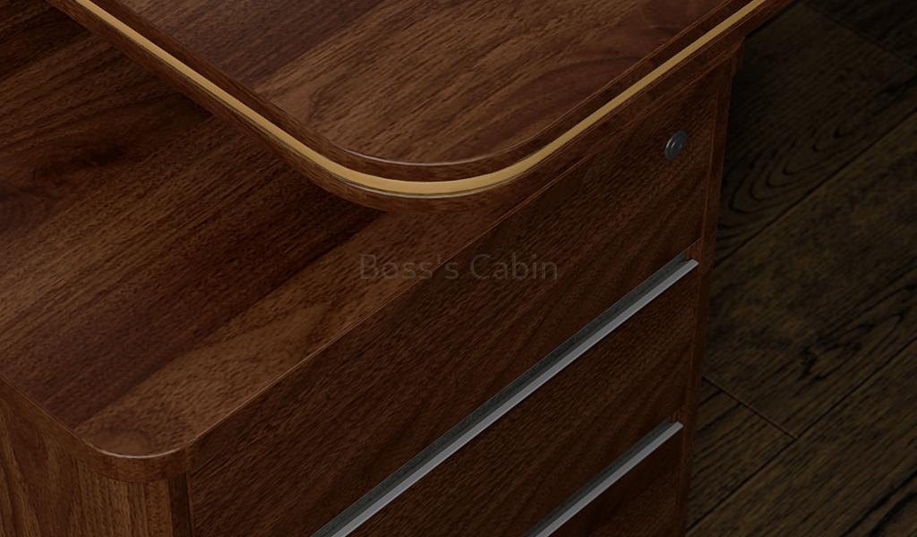 Office desk in 7 feet width with storage pedestal made with environment grade engineered wood and walnut laminate. The E1 grade MDF is a highly durable material and a world standard for premium office furniture while the walnut laminate is from our carefully selected range of premium laminates with consistent color and grain structure.