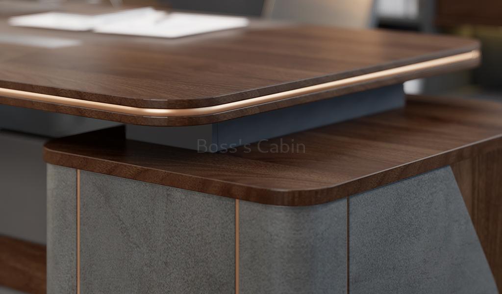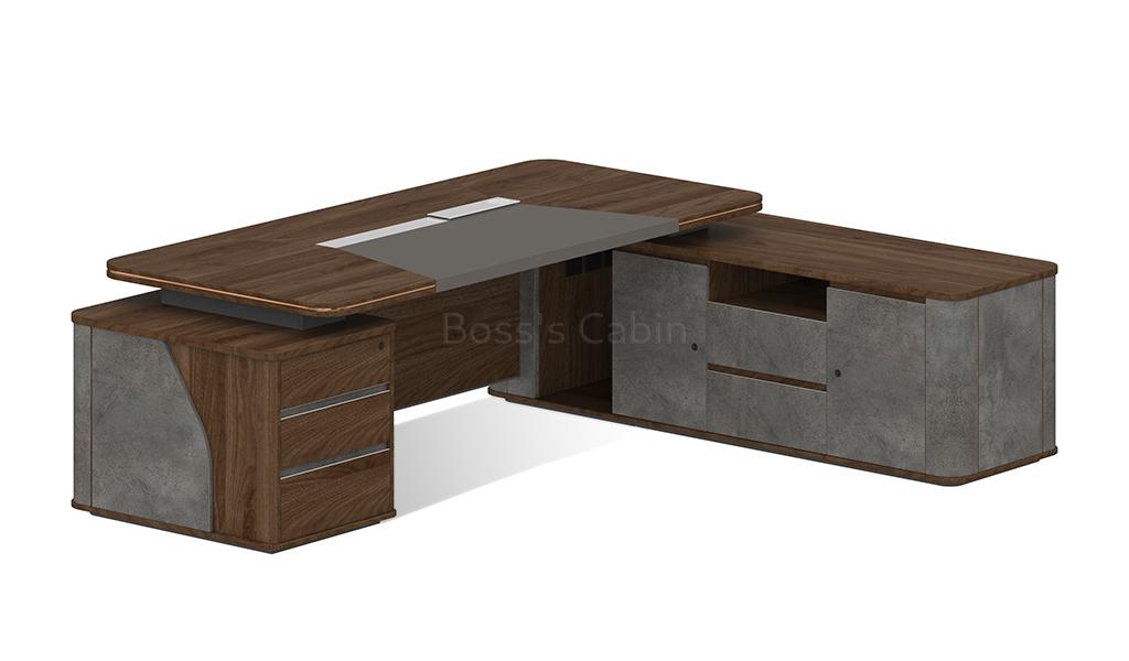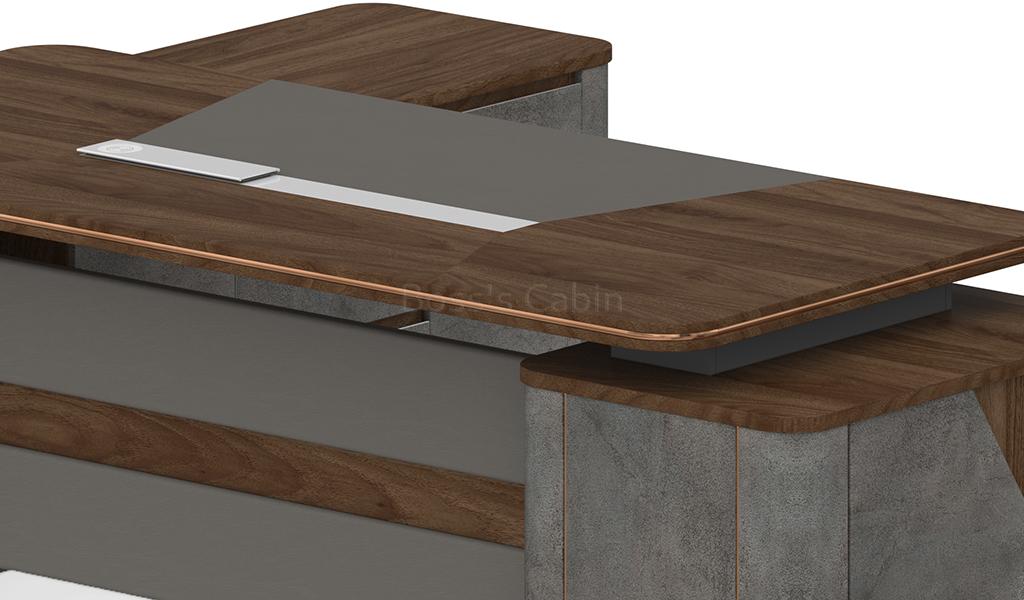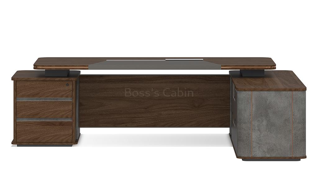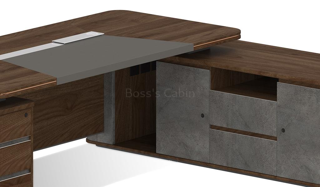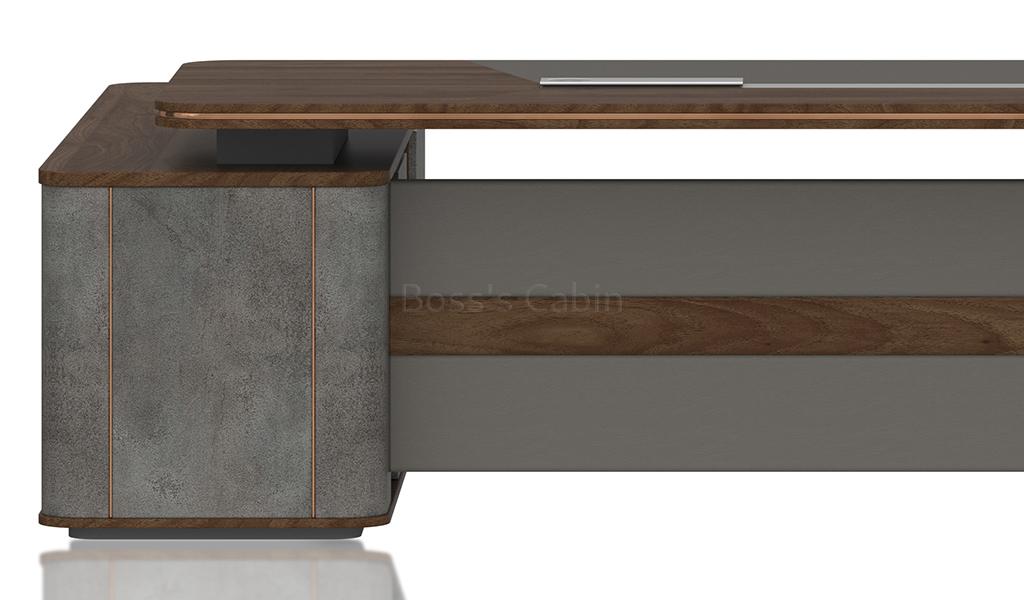 This elegant 7 feet office table with side cabinet comes in classic Norica walnut, rock gray and carbon gray combination as seen in the picture.
