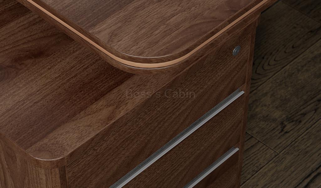 Office desk in 7 feet width made from environment grade engineered wood and walnut laminate. The E1 grade MDF is a highly durable material and a world standard for premium office furniture while the walnut laminate is from our carefully selected range of premium laminates with consistent color and grain structure.