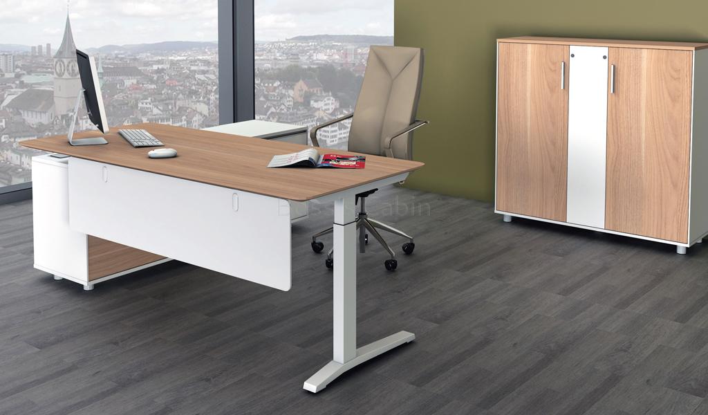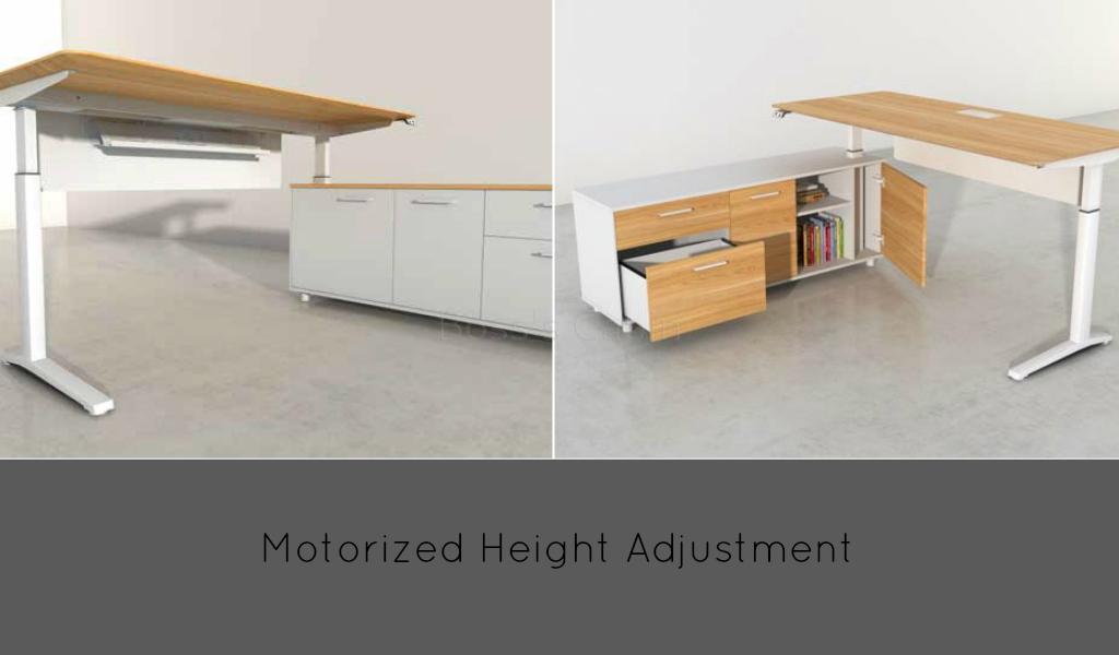 Designed with a motorized height adjustment mechanism this laminate finished executive desk includes a side cabinet too. This plug and play 6.5 feet, height adjustable office table also has an inbuilt wirebox for a clutter free work surface. Crafted with the highest quality of materials for lasting durability, natural feel and luxurious looks it is a perfect choice for a modern office cabin. It is part of the iPlus series from which you can choose an entire range other products like workstations, cabinets, conference tables etc. Download the catalog to see the entire collection of this series.