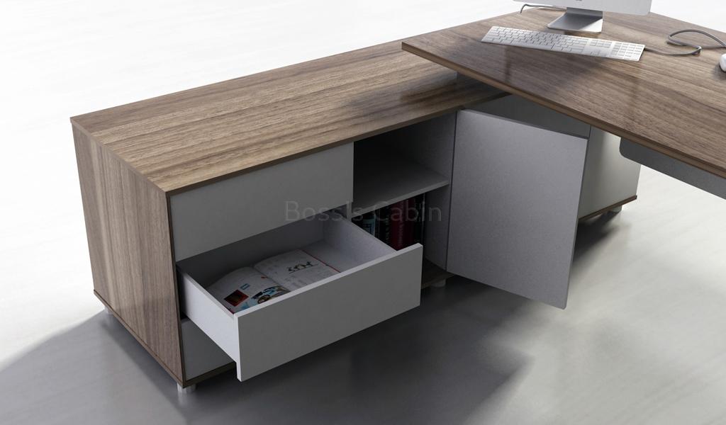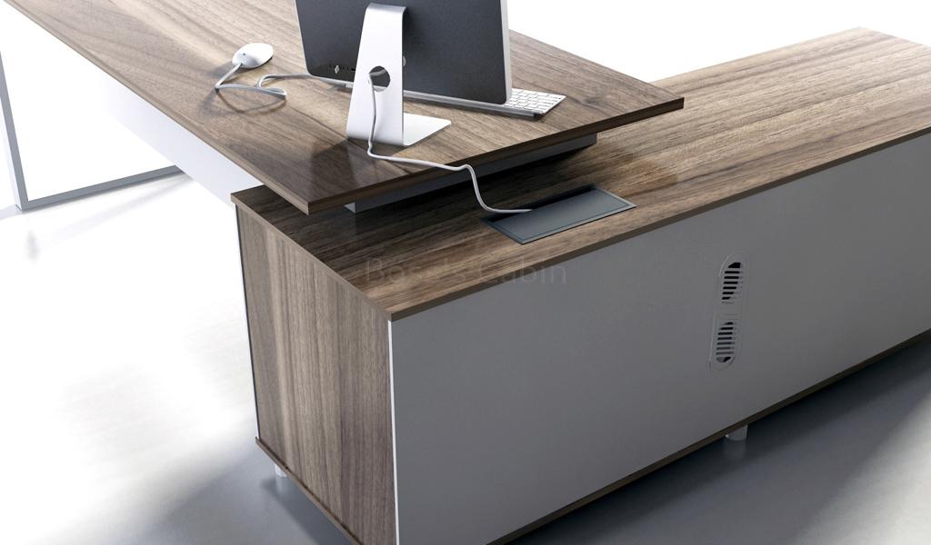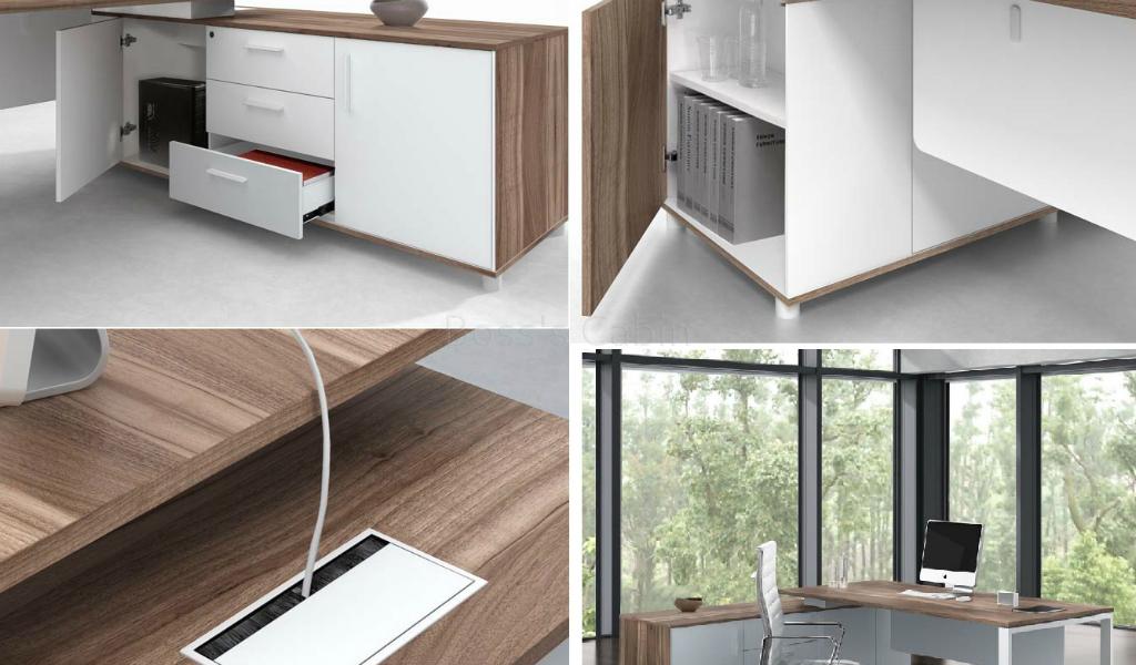 Main desk, side credenza and a built-in wire box with voice, data and power connectivity.