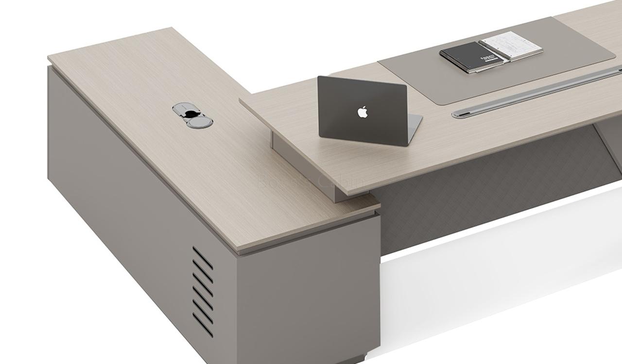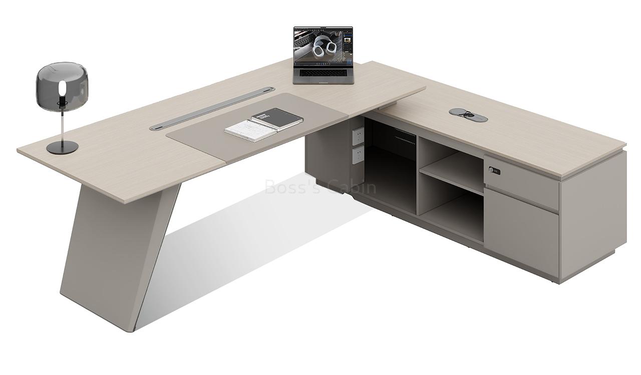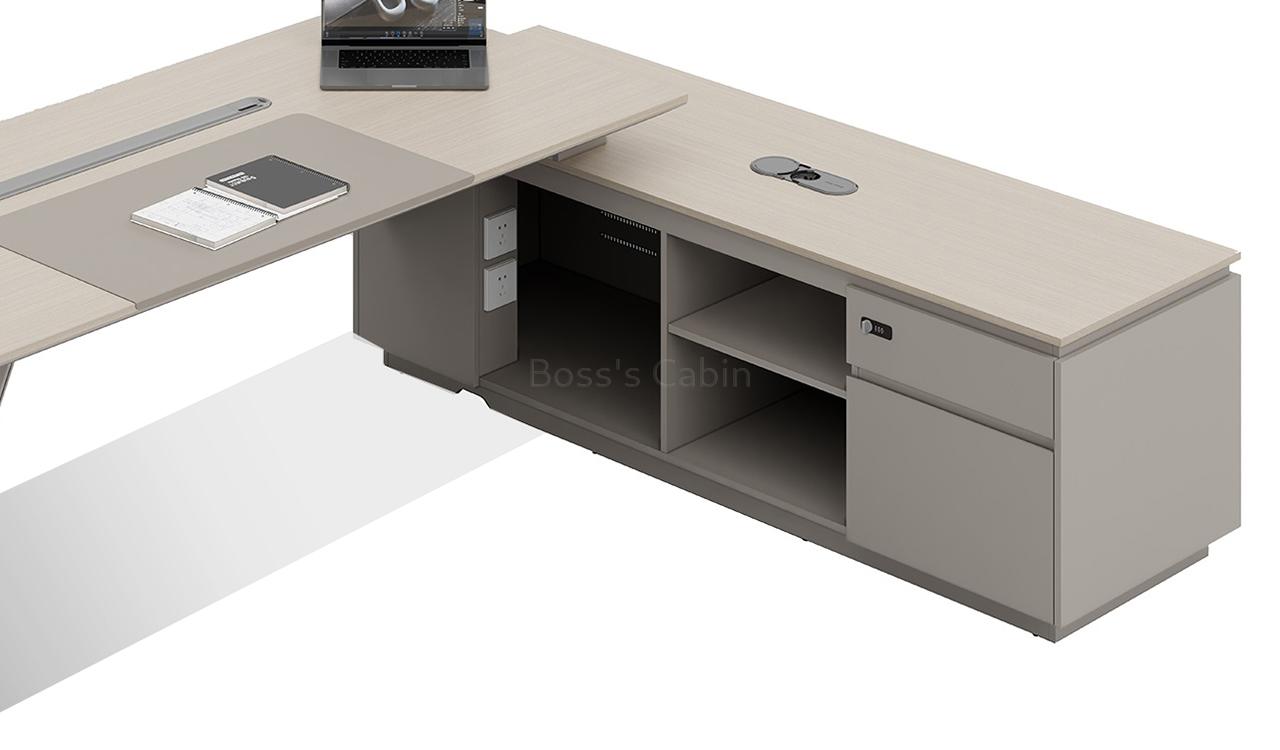 This 8 feet executive L-shaped desk blends architectural form with premium functionality. Its angled panel legs and asymmetrical privacy panel create a striking silhouette, while the dual-tone tabletop with chamfered edges adds a touch of sophistication. Designed with side cabinet with number lock drawers, inbuilt wire-management grommets and power sockets under the top it pairs seamlessly with all Lucira series products.