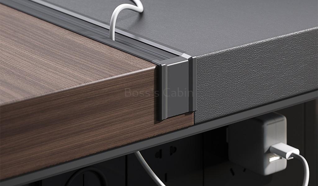 An 8-foot-wide, elegantly crafted office desk designed for contemporary office cabins. The desktop features a built-in leather writing pad and Pari Walnut laminate cladding. An integrated side cabinet offers ample storage, inbuilt cable management, and power sockets discreetly positioned beneath the tabletop. Part of the Nexa Series, this desk is ideal for office cabins of 200 sq. ft. and above.