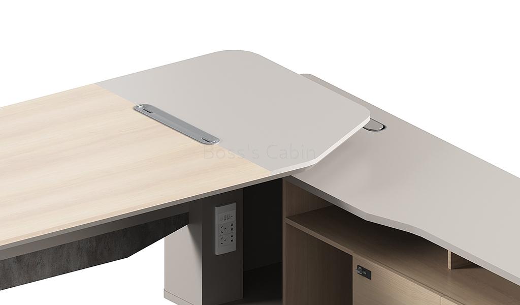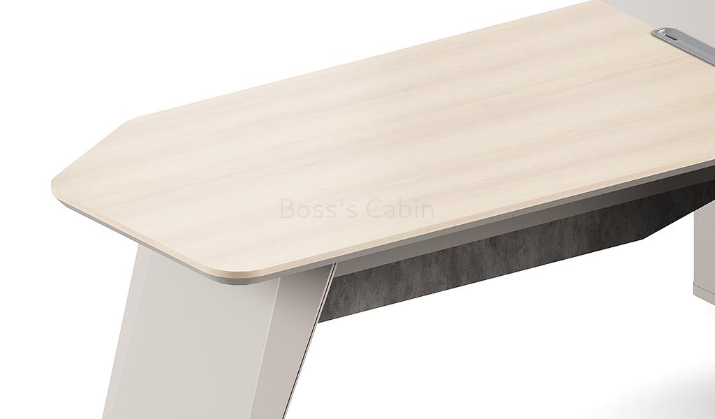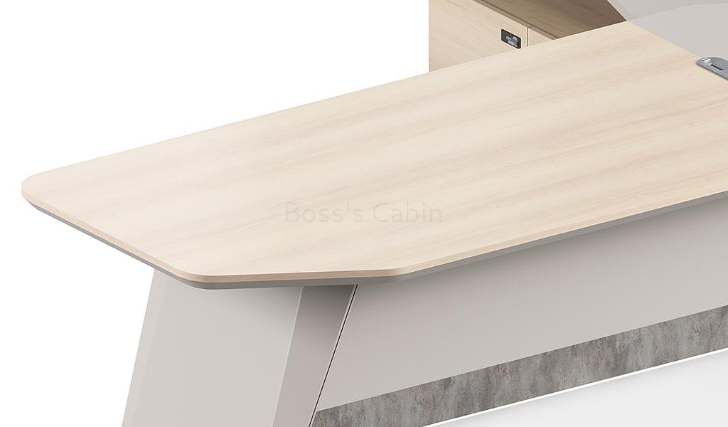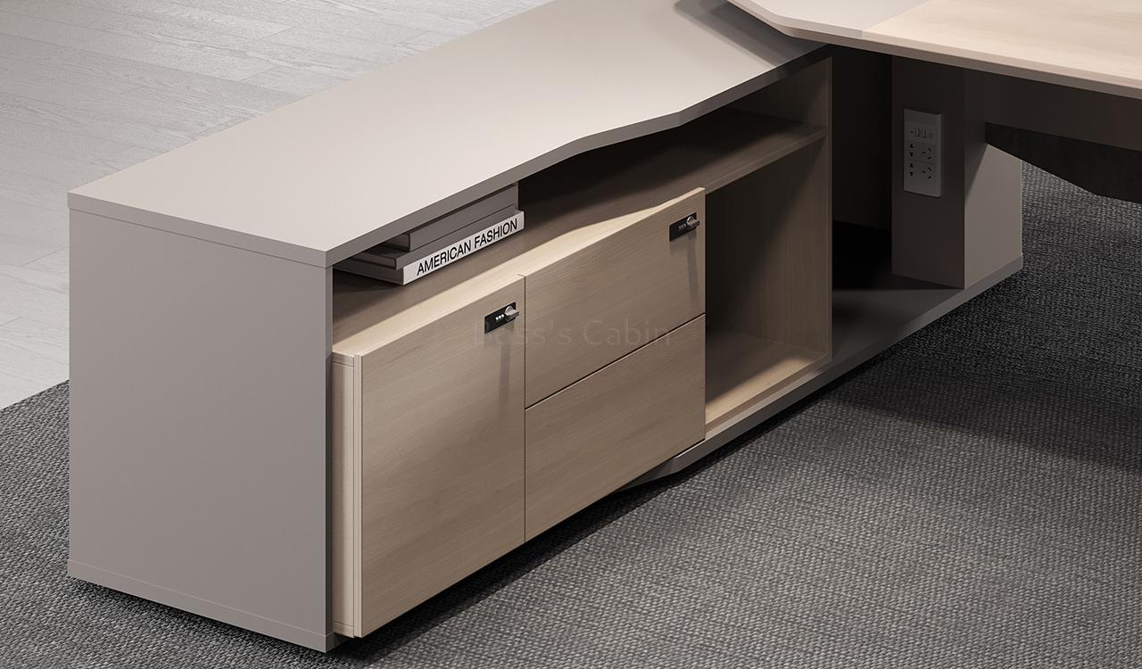 A large size office table in a combination of contemporary pearwood and seagull gray laminate with side cabinet that includes a wirebox, storage drawers with number lock, shelves and CPU storage space. Dual tone tabletop designed with chamfered edges and a sleek inbuilt wire management grommet for connecting your devices. Suitable for cabin size of 200 sft and more.