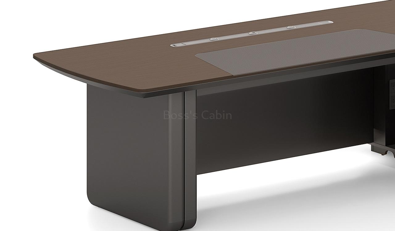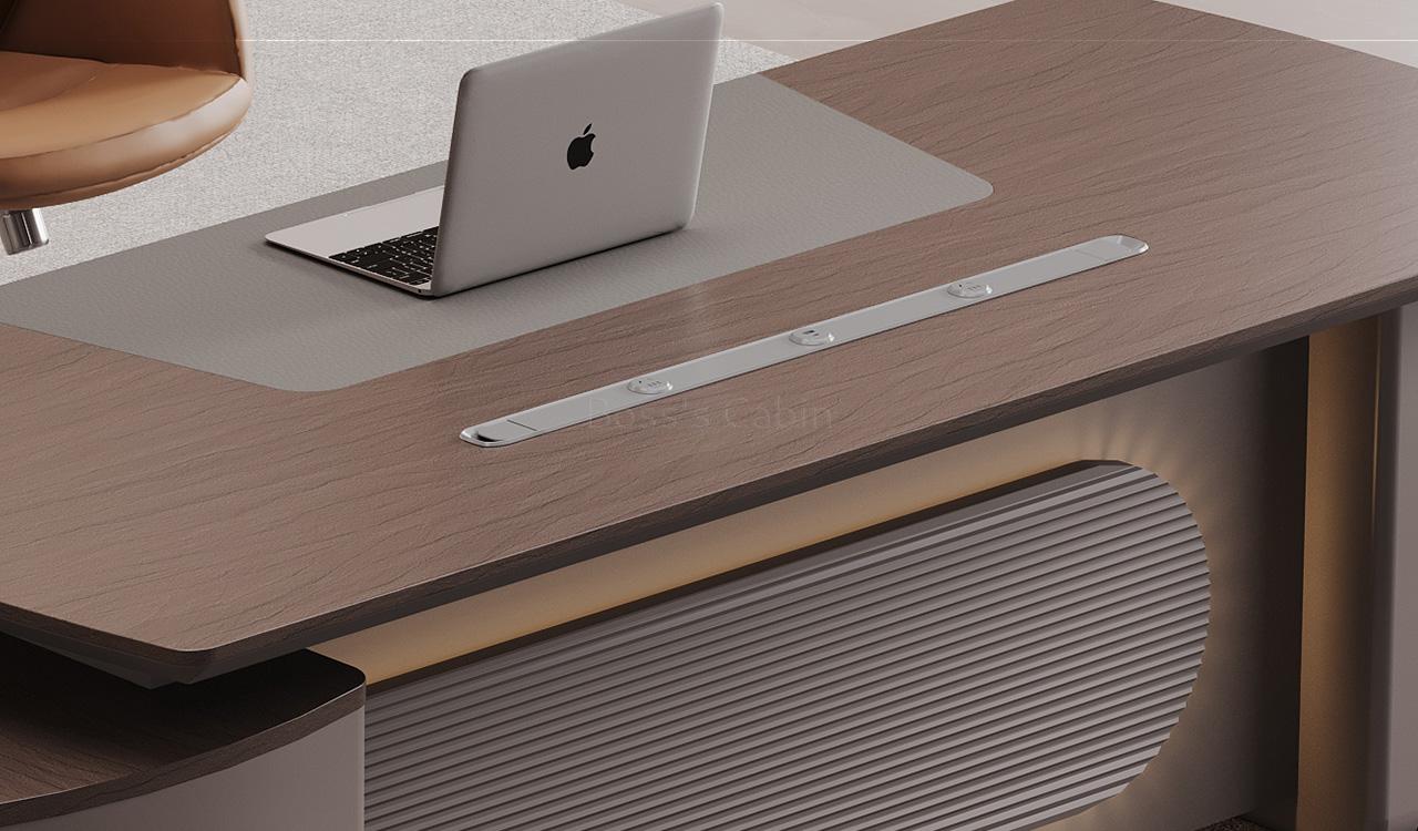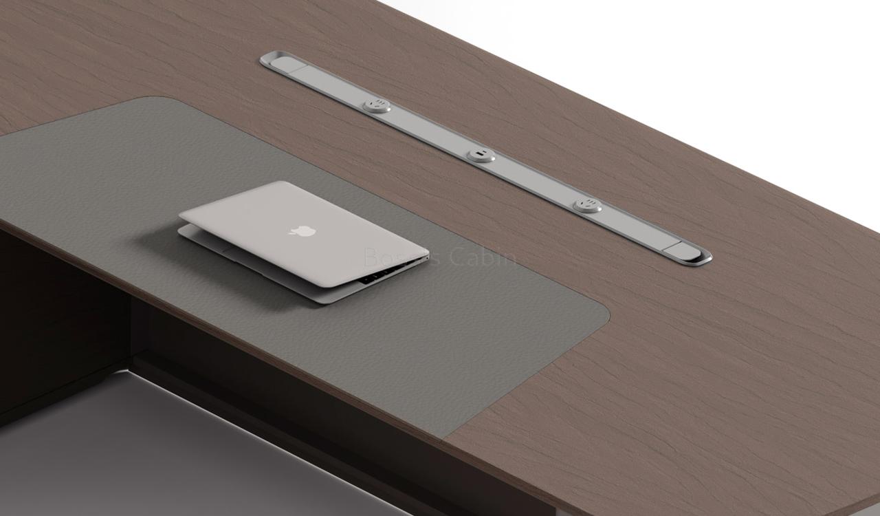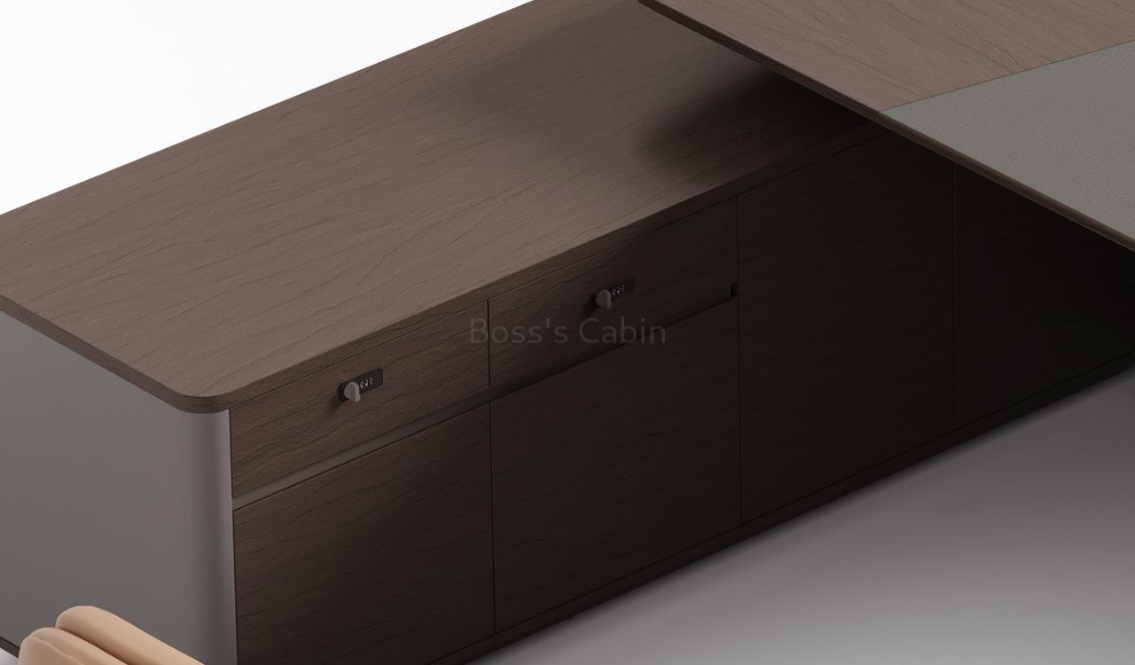 1. Dual tone tabletop in walnut & gray combination. 2. Side cabinet with swing door/open shelf & drawers with number lock. 3. Tabletop with integrated power track with sockets.