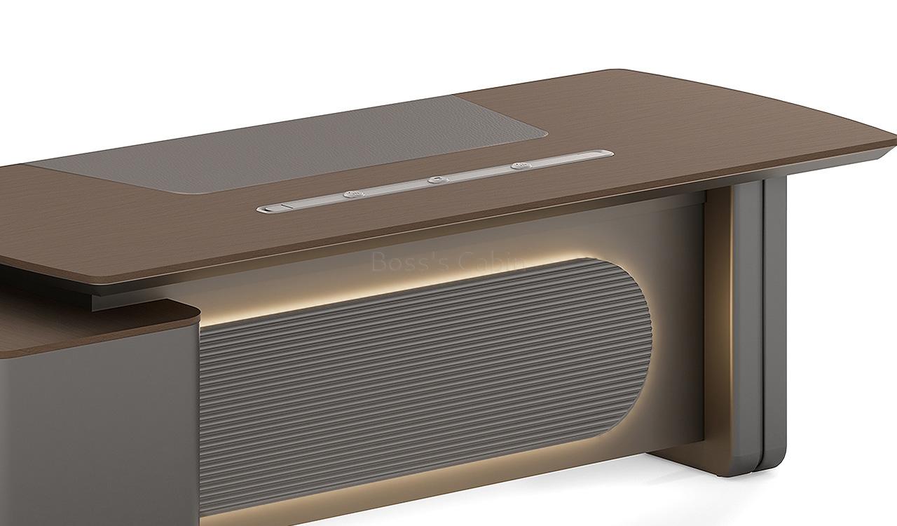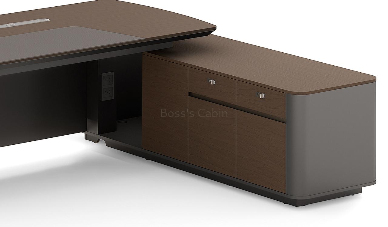 An elegant office desk in Nackle Walnut and X-Gray, perfect for modern interiors. The rounded-edge side cabinet includes number-locked drawers and swing-door storage with a shelf. Its dual-surface, two-tone top features chamfered edges for a smooth, dynamic profile. A sleek wire-track with sockets ensures a clutter-free workspace. The luxurious modesty panel, enhanced with concealed LED lighting, elevates the aesthetic. Ideal for cabins of 200 sq. ft. or more. Part of the Prima series, offering more matching products for a cohesive setup.