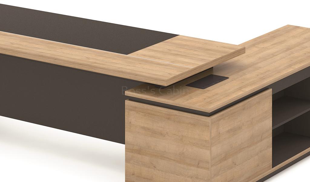 Main office table in light wood finish with side credenza and inbuilt wire box for cable management.