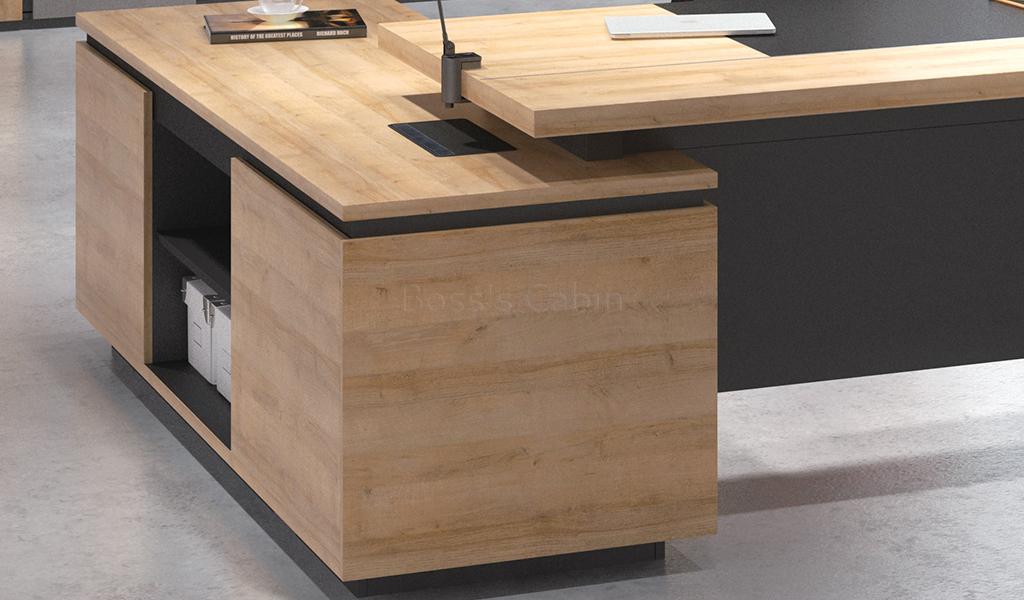 The office desk and side cabinet are made with environment grade engineered wood and wood finish laminate. The E1 grade MDF is a highly durable material and a world standard for premium office furniture while the laminate is from our carefully selected range of premium laminates with consistent color and grain structure.