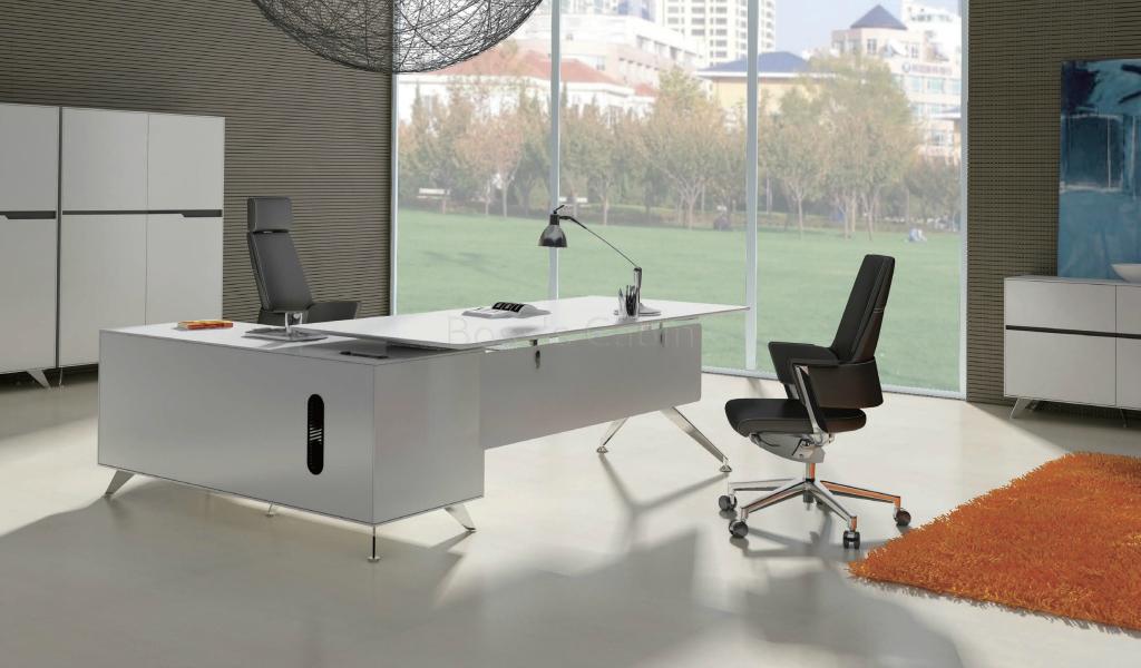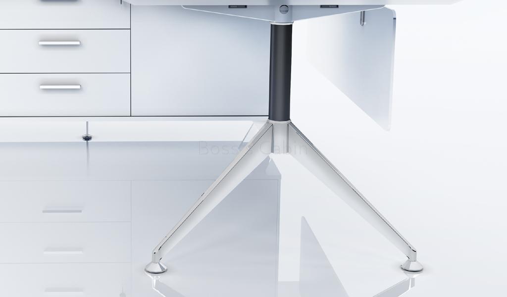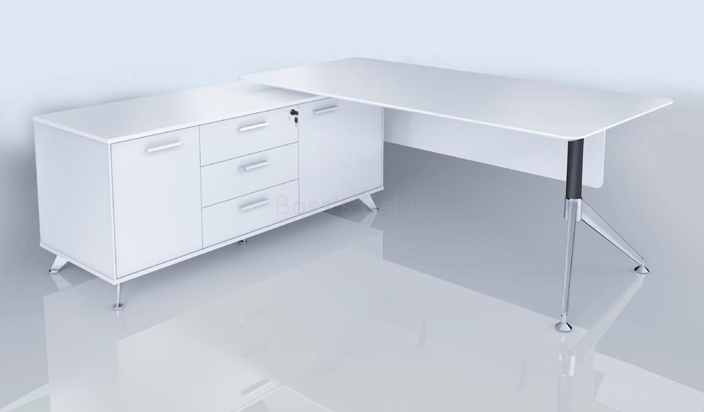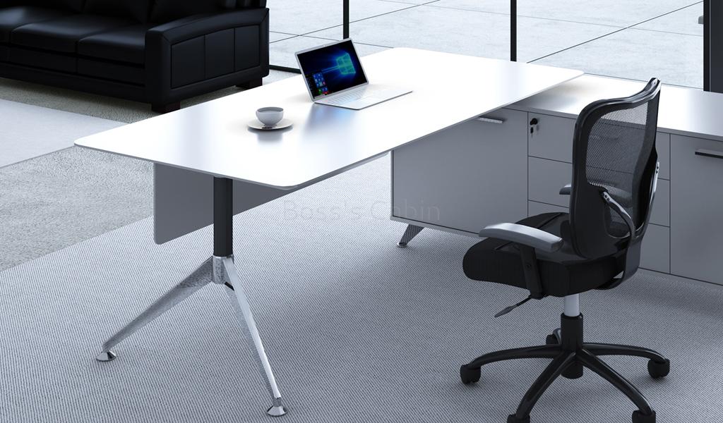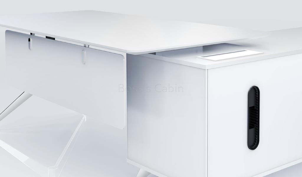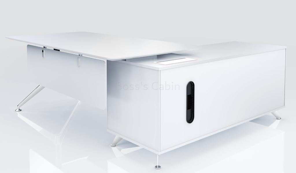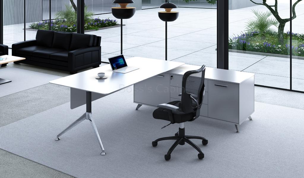 A contemporary office desk designed in all white finish with solid aluminum alloy legs. Includes side credenza with inbuilt wire management box and privacy panel. Ideal for small cabins and modern interiors.